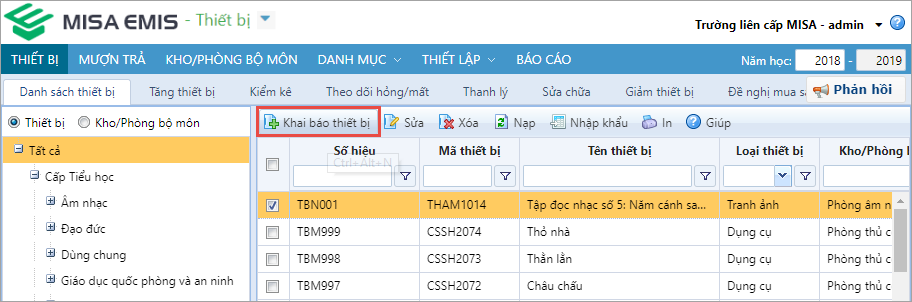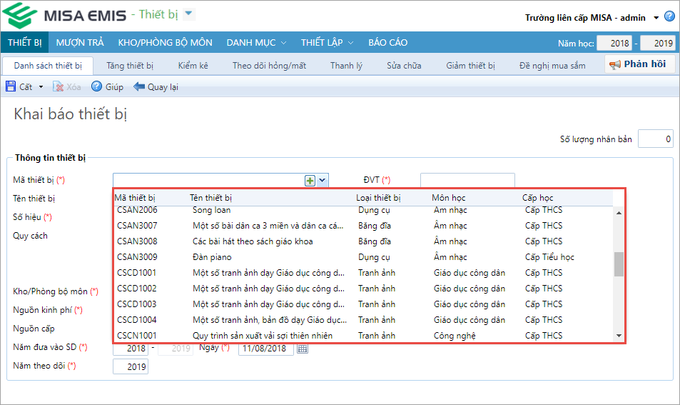 1. Đối với thiết bị giáo dục đang sử dụng trong phần mềm, cán bộ quản lý thiết bị có nhu cầu mua sắm thêm để sử dụng, thì khi thực hiện khai báo các thiết bị được mua thêm này sẽ không cần khai báo Số hiệu mới mà nhập lại theo Số hiệu cũ của thiết bị giáo dục đã có.