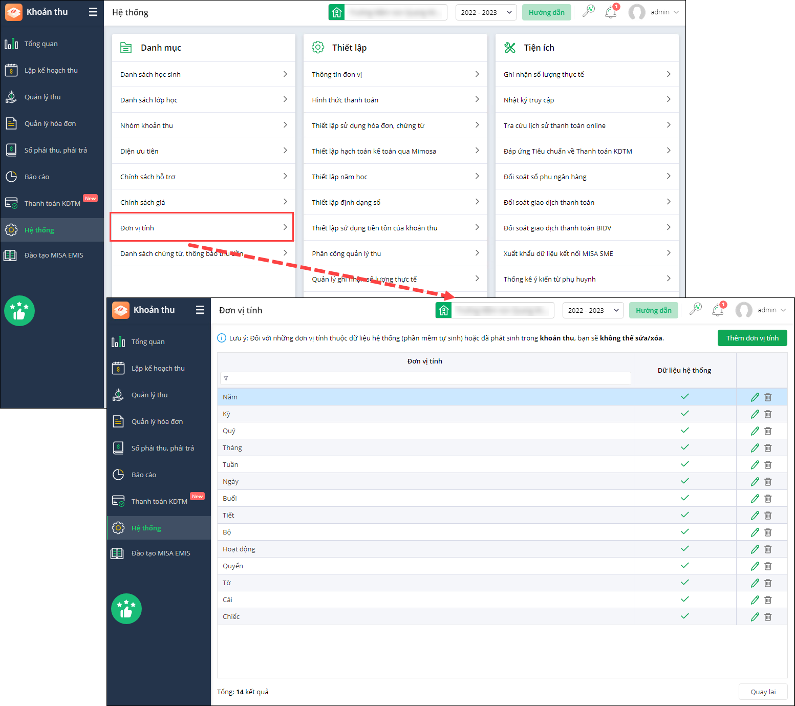 - Cho phép Thêm mới/Sửa/Xóa đơn vị tính của khoản thu tại đơn vị.