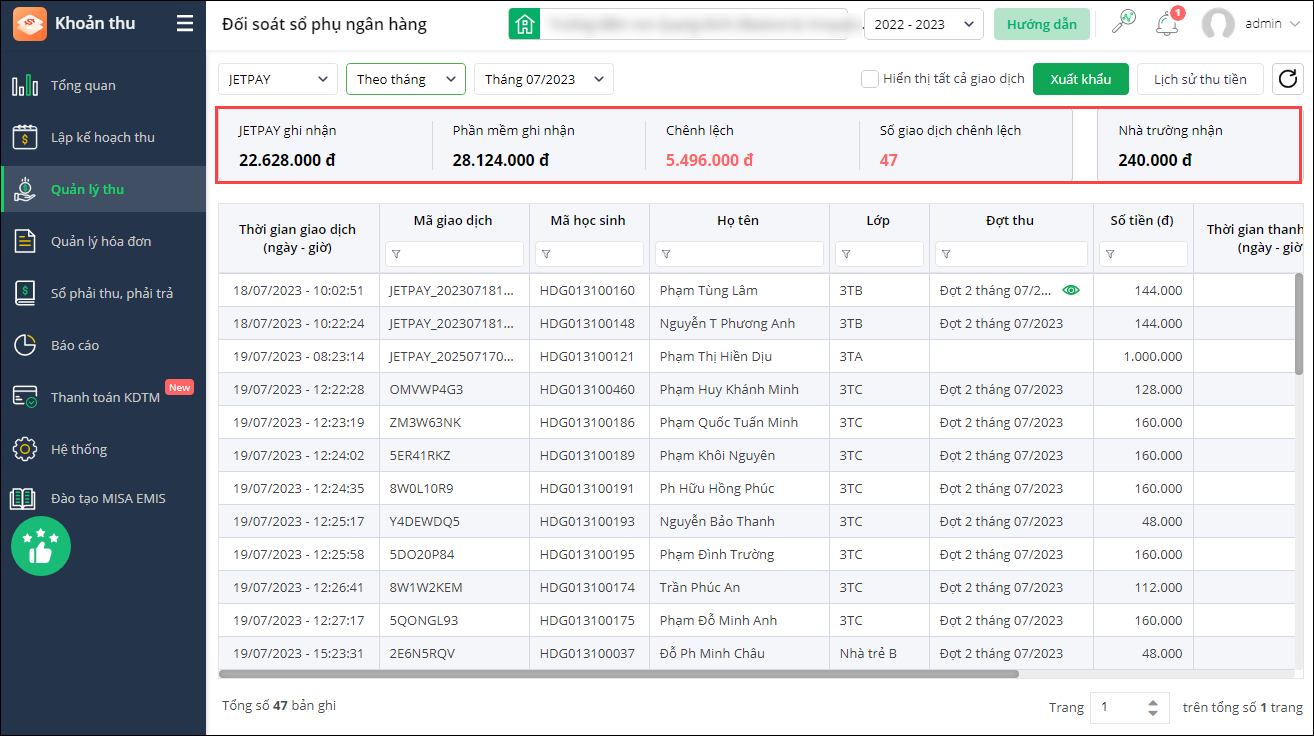 - Nhà trường mất thời gian đối soát số lượng giao dịch trên JETPAY và tình trạng gạch nợ trên EMIS Khoản thu.