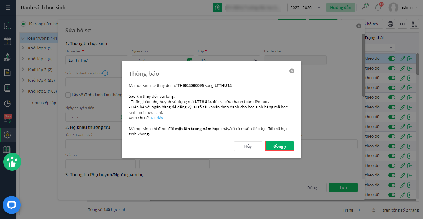 - Khi sửa hồ sơ học sinh: