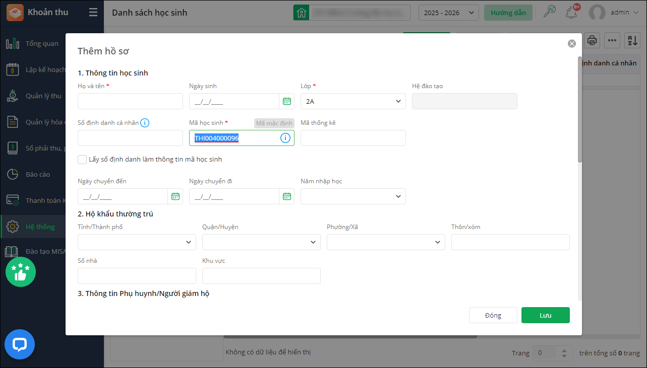 - Khi thêm mới hồ sơ học sinh: Cho phép Kế toán tự nhập thông tin Mã học sinh.
