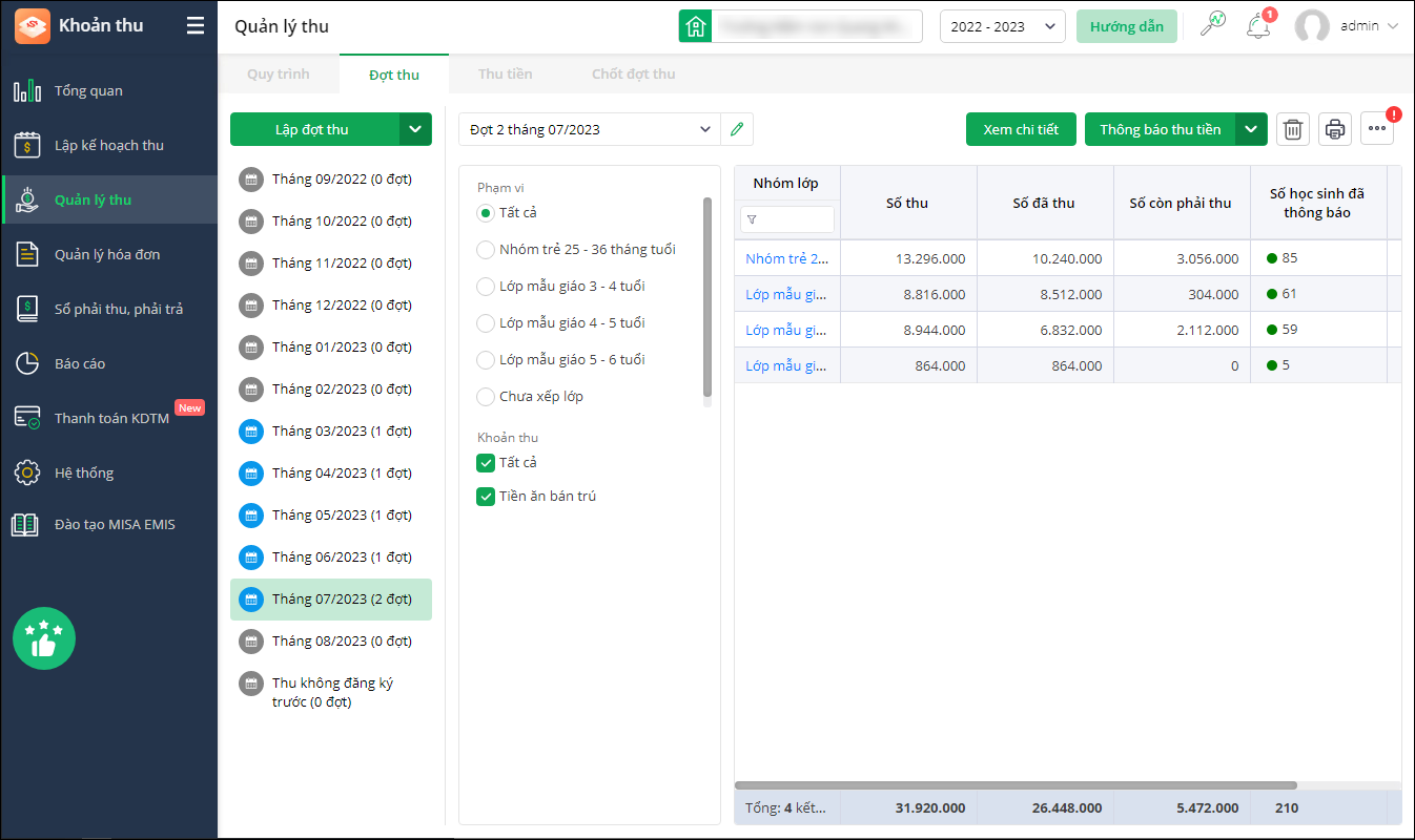 - Số học sinh đã thông báo: Hiển thị số lượng học sinh đã gửi Thông báo thu tiền.