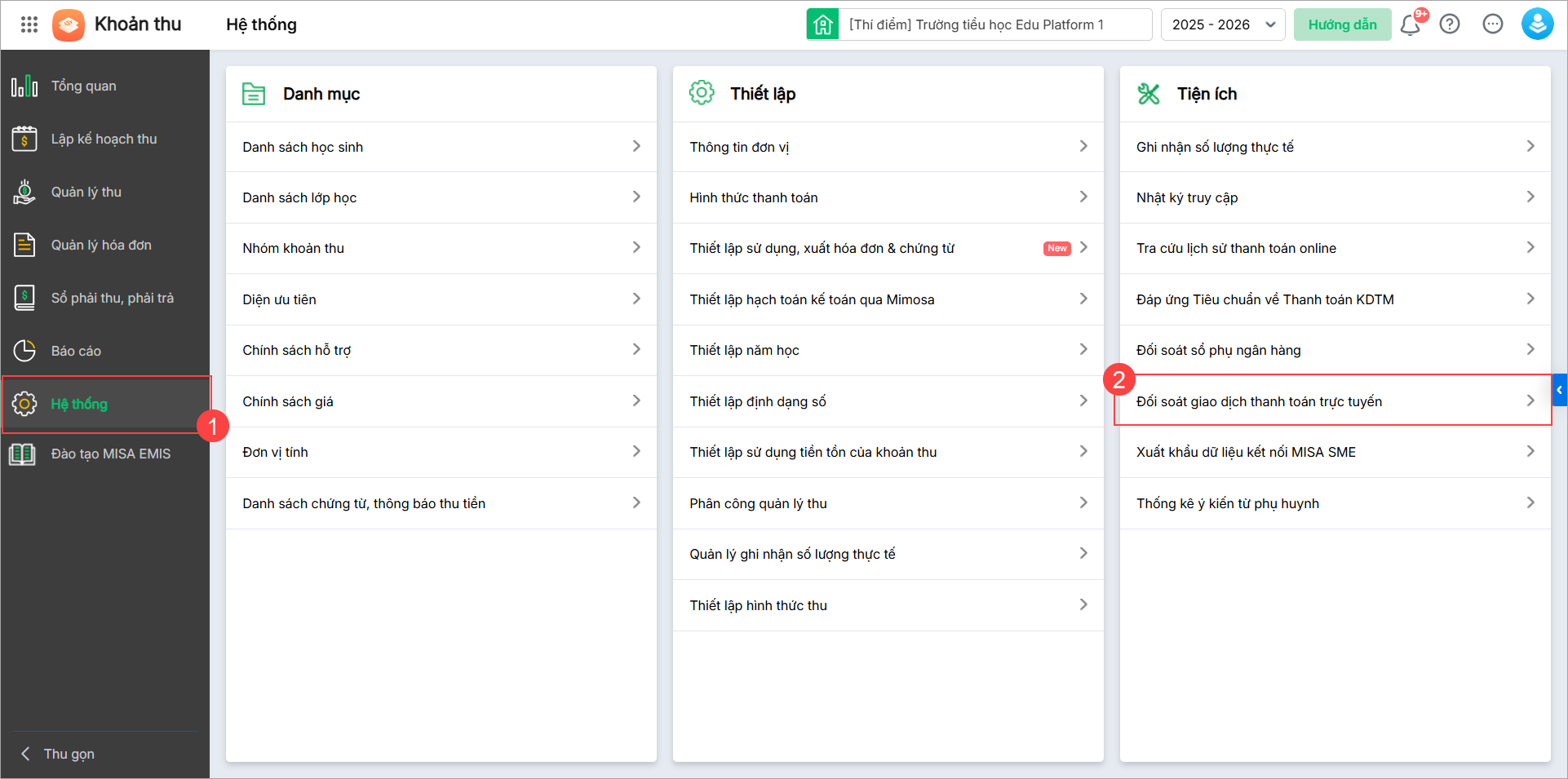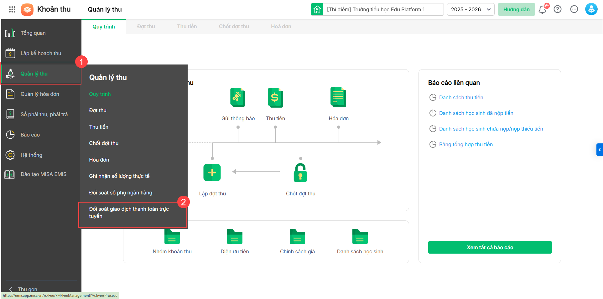 - hoặc vào Quản lý thu\Đối soát giao dịch thanh toán trực tuyến.
