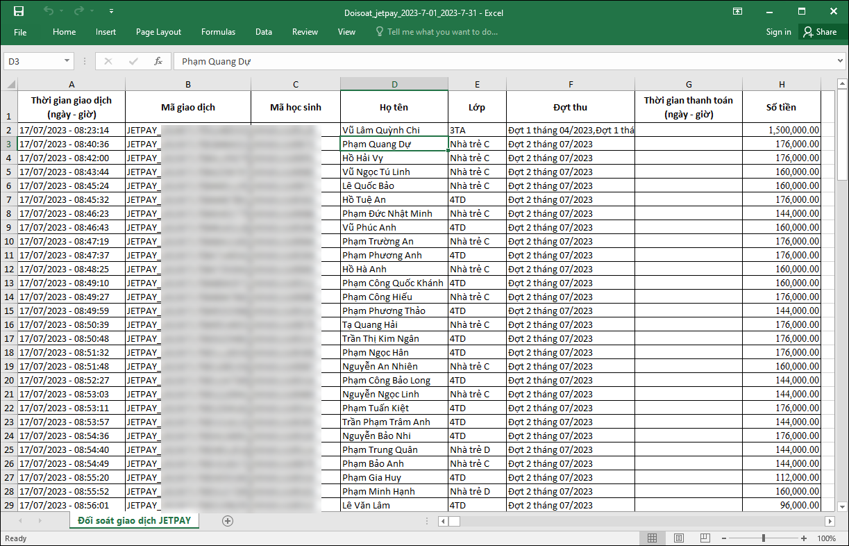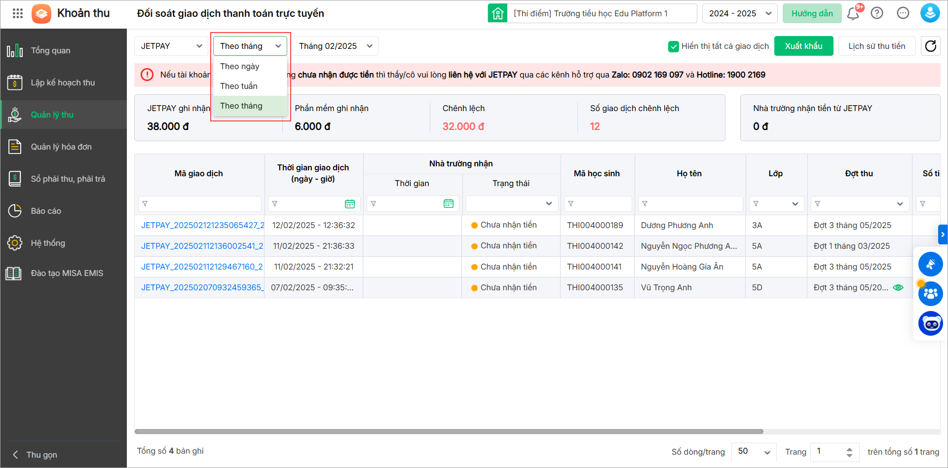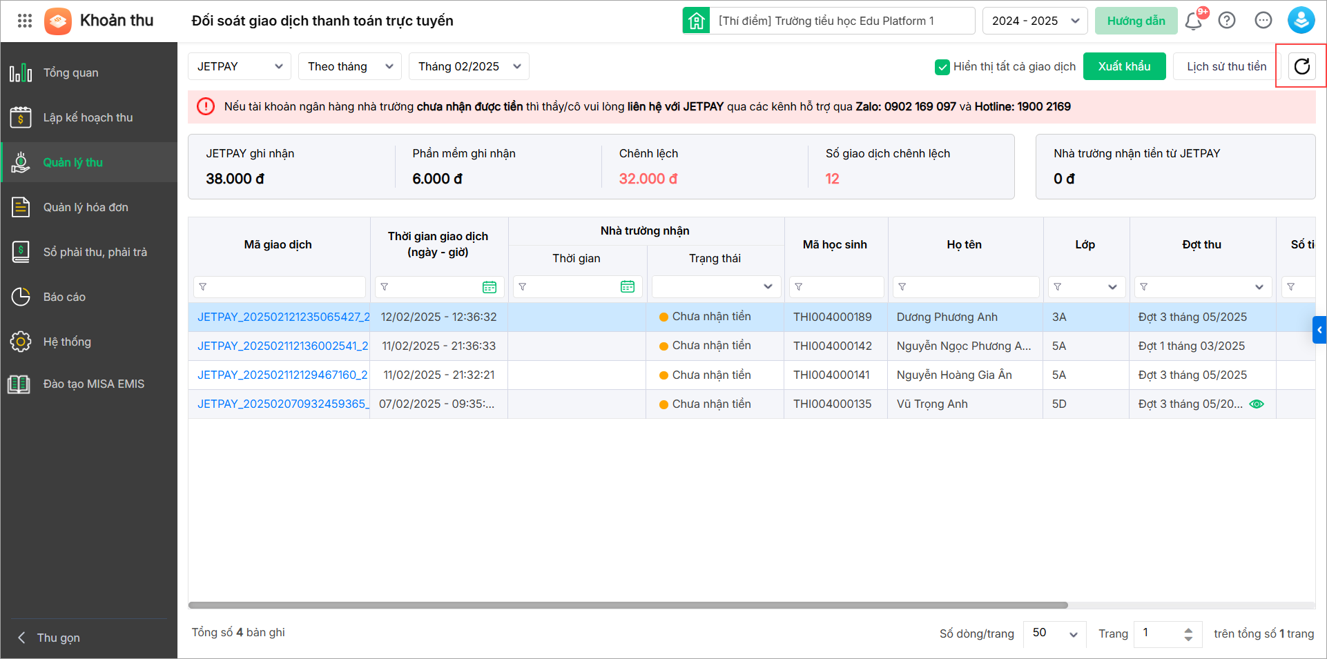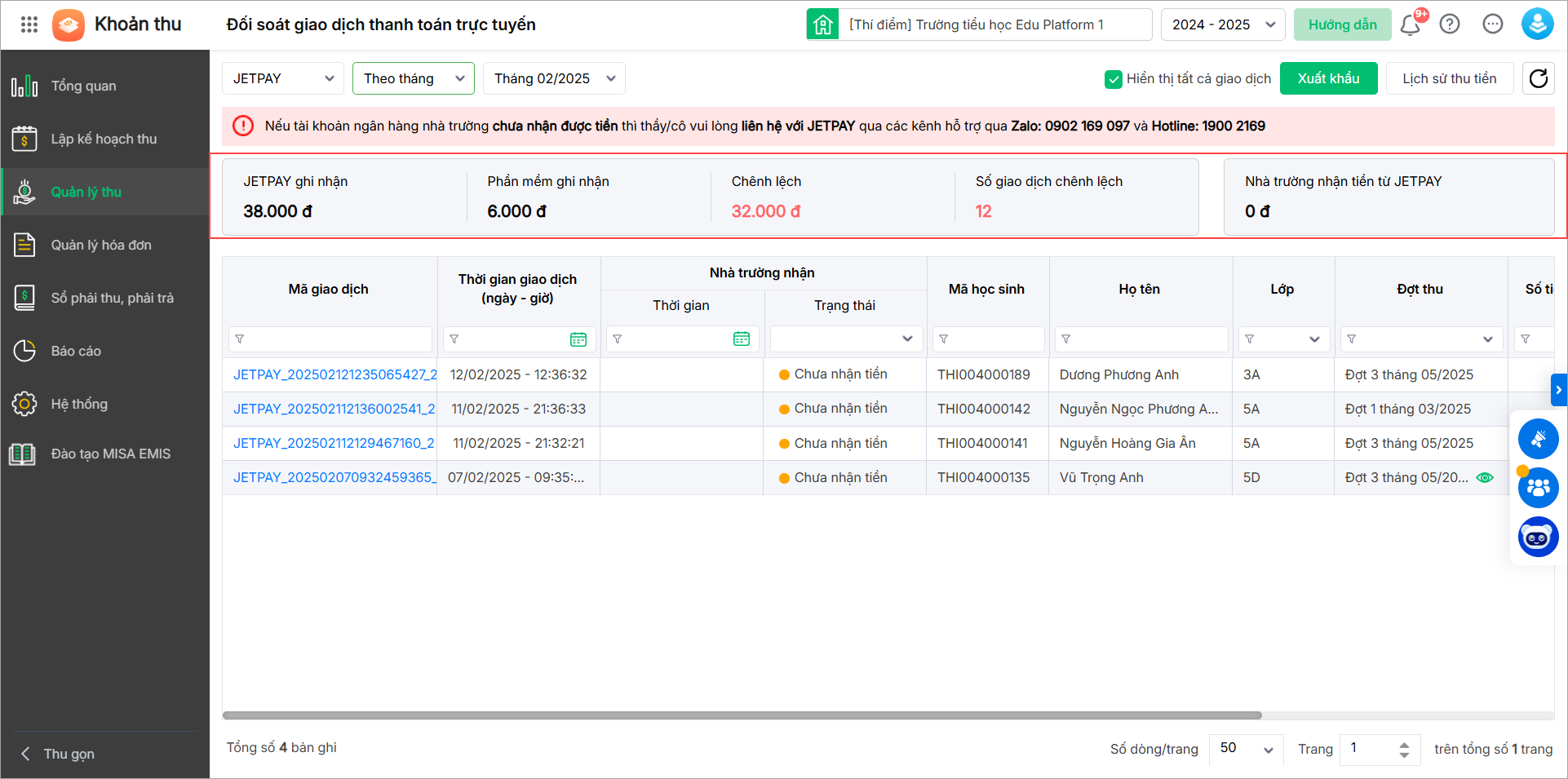 - Kế toán có thể theo dõi tất cả những giao dịch thanh toán trực tuyến phụ huynh đã thực hiện qua JETPAT Nhà trường. Nắm bắt nhanh số tiền JETPAY ghi nhận; số tiền Phần mềm ghi nhận; số tiền Chênh lệch và Số giao dịch chênh lệch cùng số tiền Nhà trường nhận.