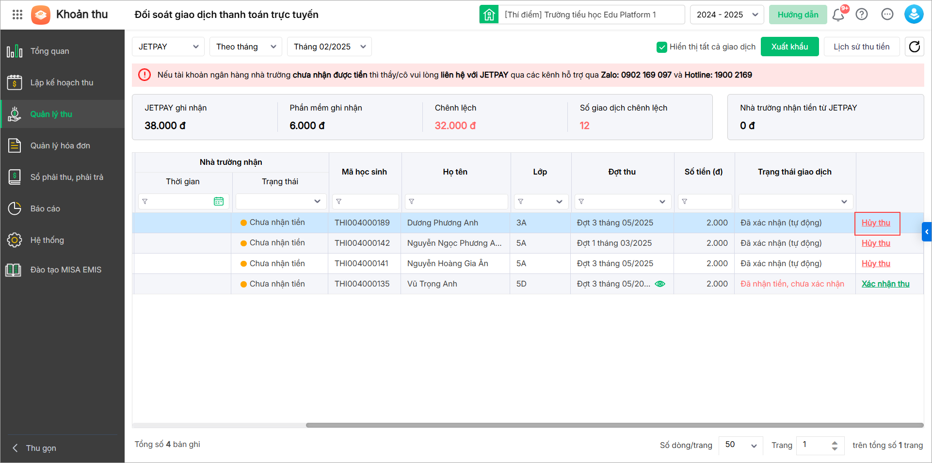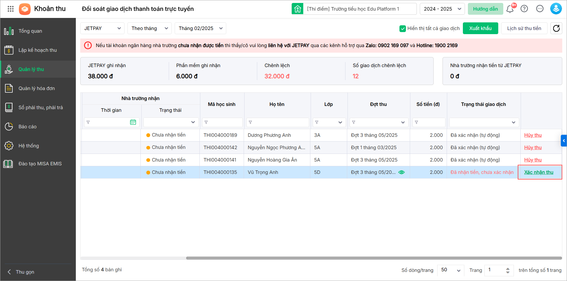 - Chưa nhận tiền, đã xác nhận: Là giao dịch lỗi, nhà trường chưa nhận được tiền nhưng phần mềm đã tự động xác nhận thu.