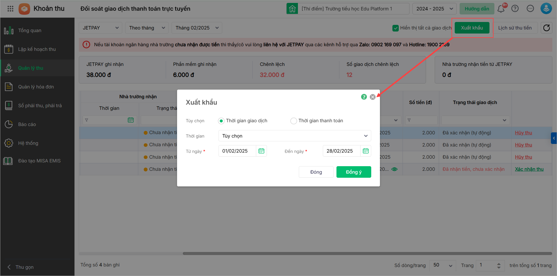 - Kế toán có thể theo dõi tất cả những giao dịch thanh toán trực tuyến phụ huynh đã thực hiện qua JETPAT Nhà trường. Nắm bắt nhanh số tiền JETPAY ghi nhận; số tiền Phần mềm ghi nhận; số tiền Chênh lệch và Số giao dịch chênh lệch cùng số tiền Nhà trường nhận.