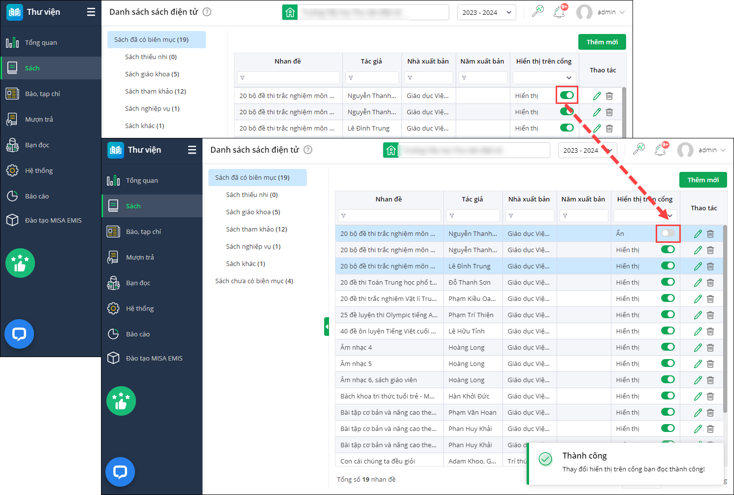 - Mặc định hiển thị sách trên Cổng thư viện điện tử, anh/chị có thể ẩn hiển thị nếu muốn.