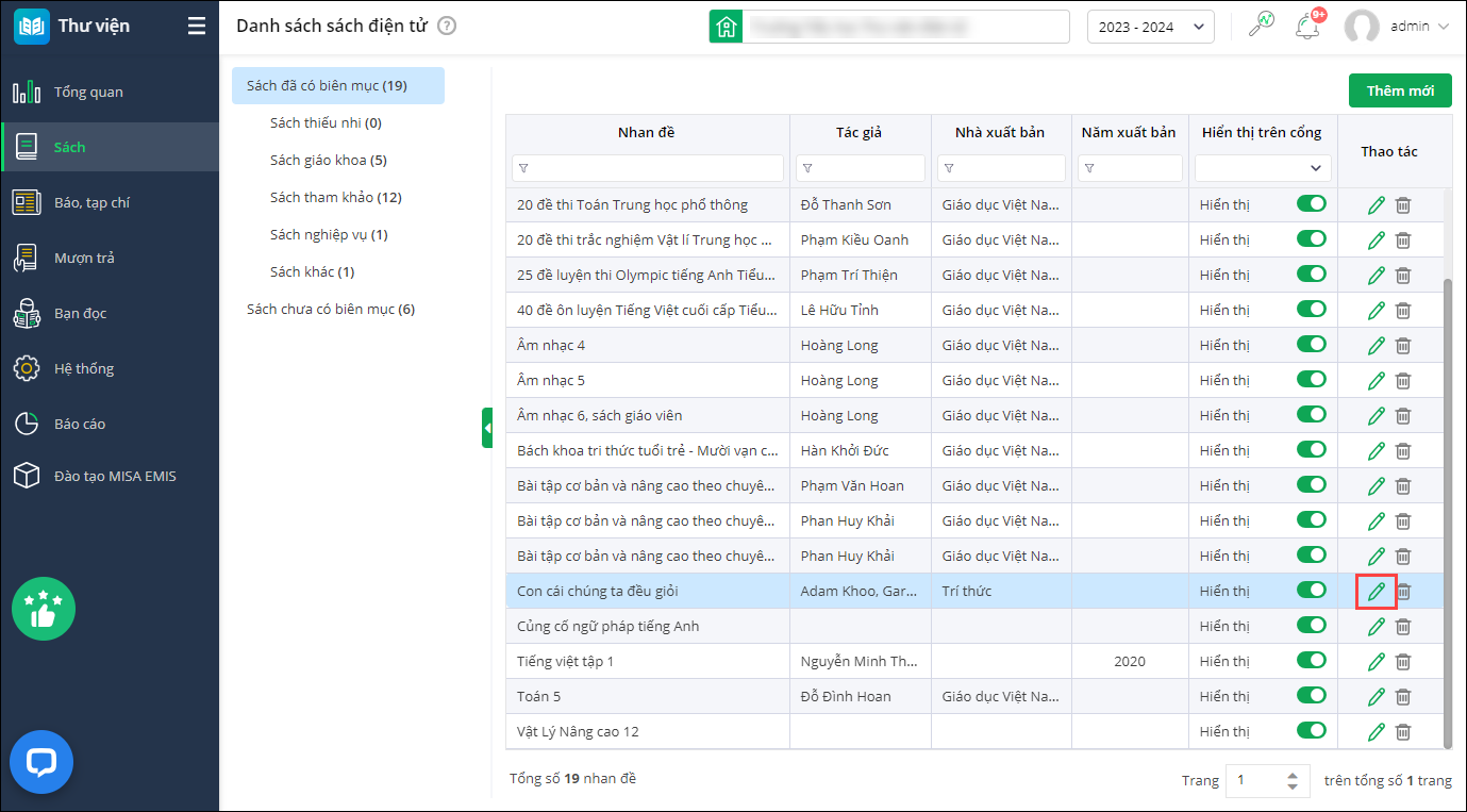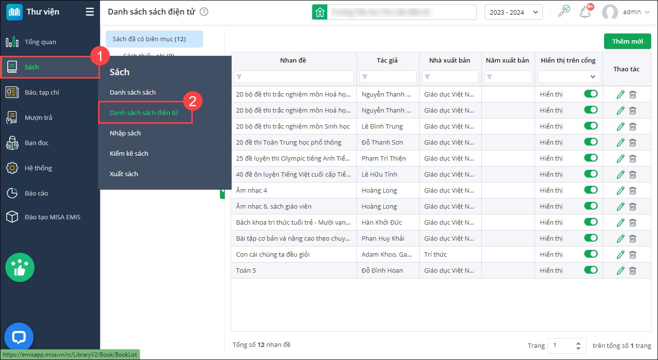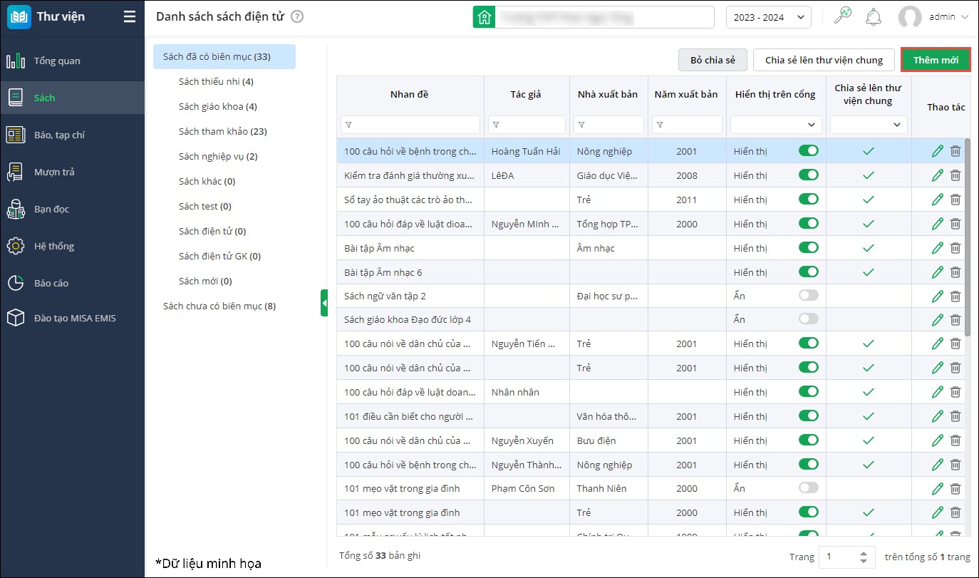 - Để bổ sung sách điện tử vào hệ thống, chọn Thêm mới.