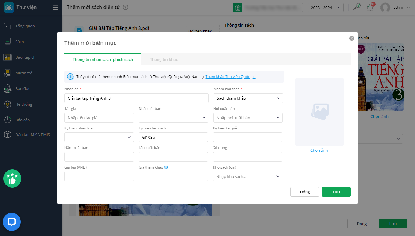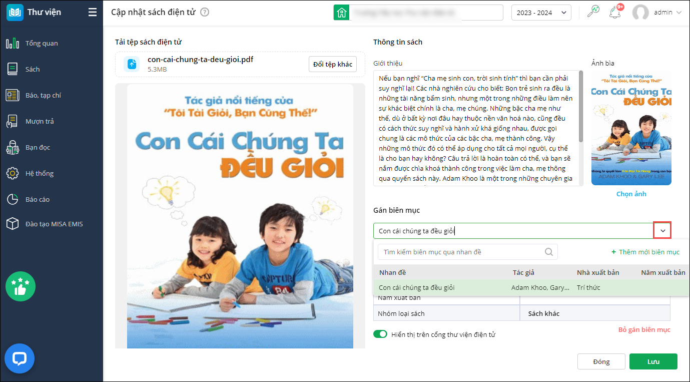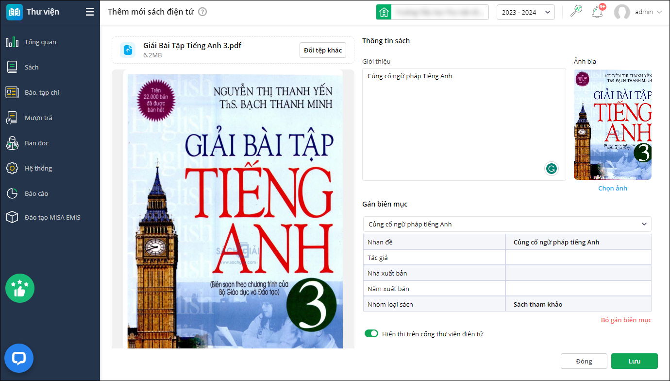 - Nhấn Lưu để cập nhật thông tin sách điện tử trê EMIS Thư viện và Cổng thư viện điện tử.