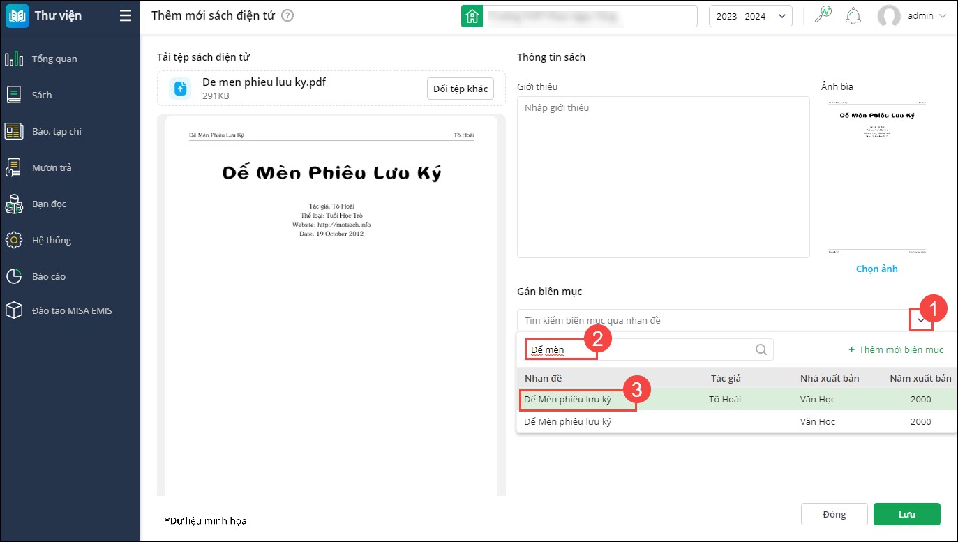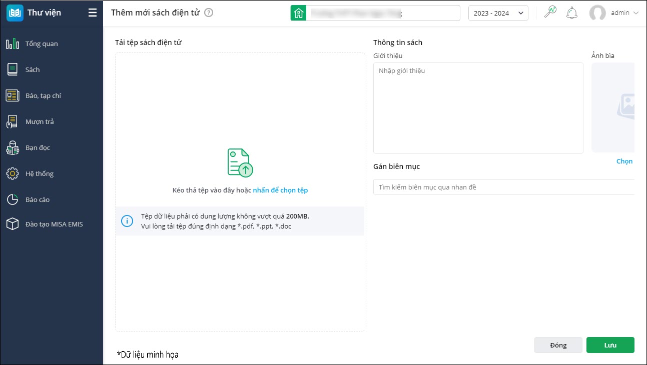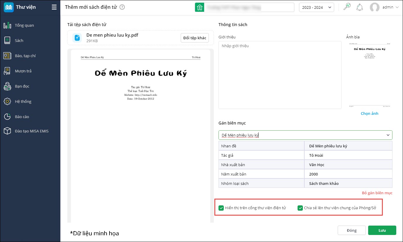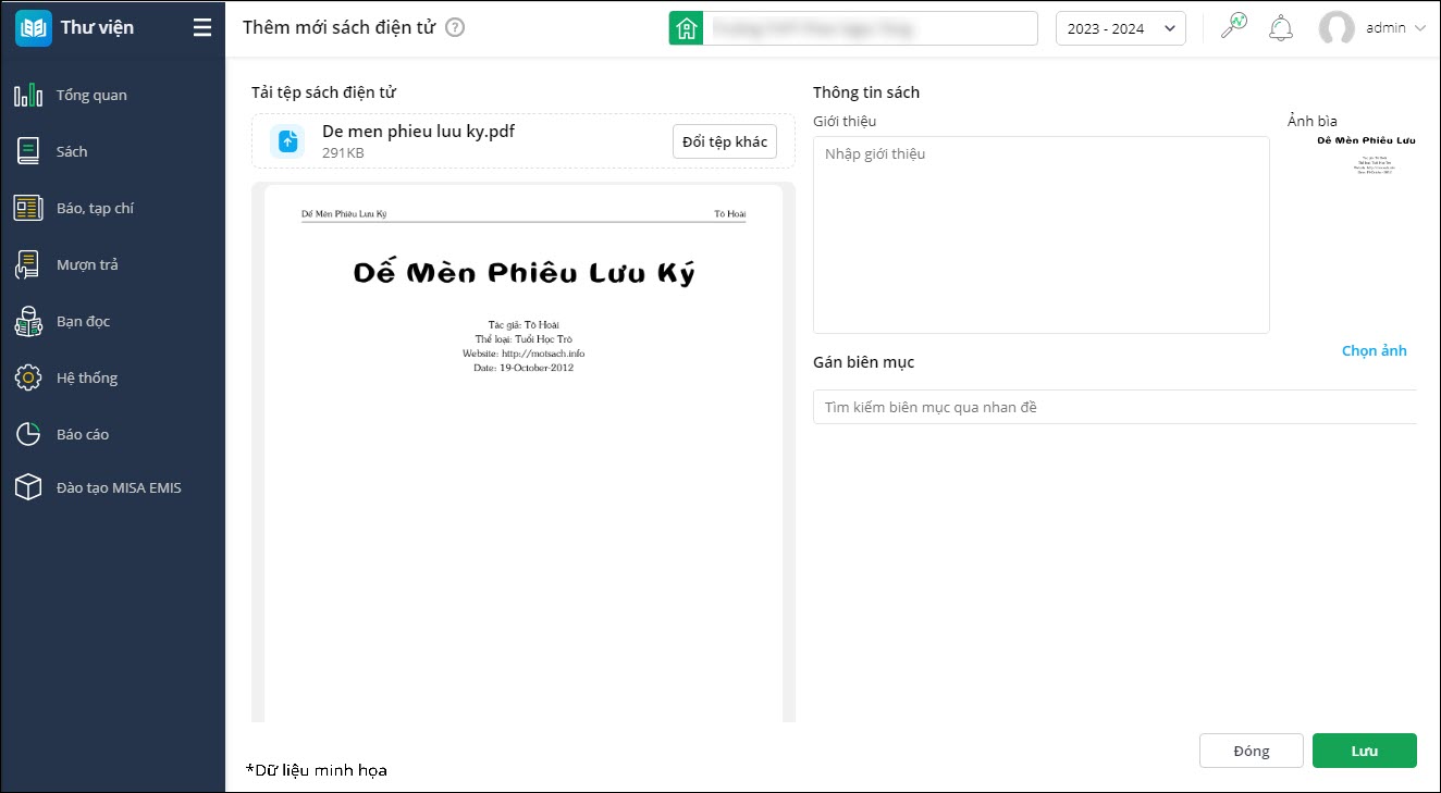 - Nhấn Lưu để cập nhật thông tin sách điện tử trê EMIS Thư viện và Cổng thư viện điện tử.