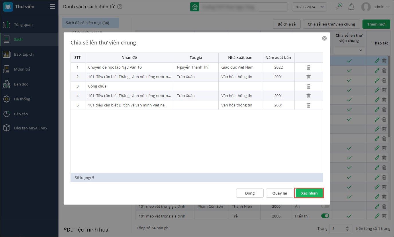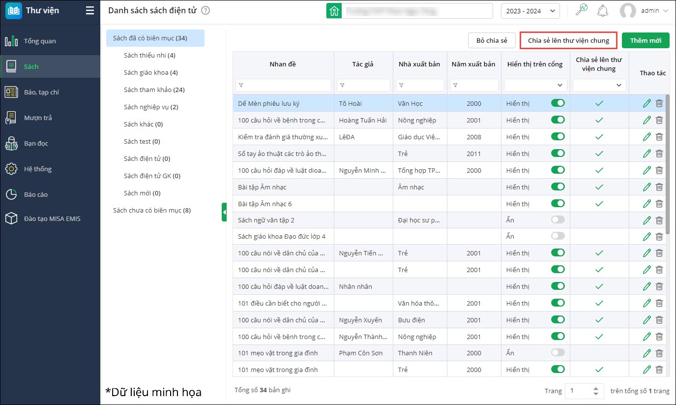 Với những đầu sách điện tử đã tải lên, Nhà trường có thể chia sẻ cho thư viện chung của Phòng/Sở.
