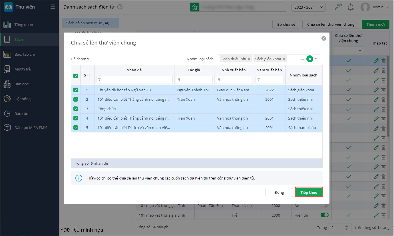 - Phần mềm mặc định lấy lên danh sách những sách điện tử đã hiển thị trên cổng thư viện điện tử, nhấn Tiếp theo để chia sẻ lên Thư viện chung.
