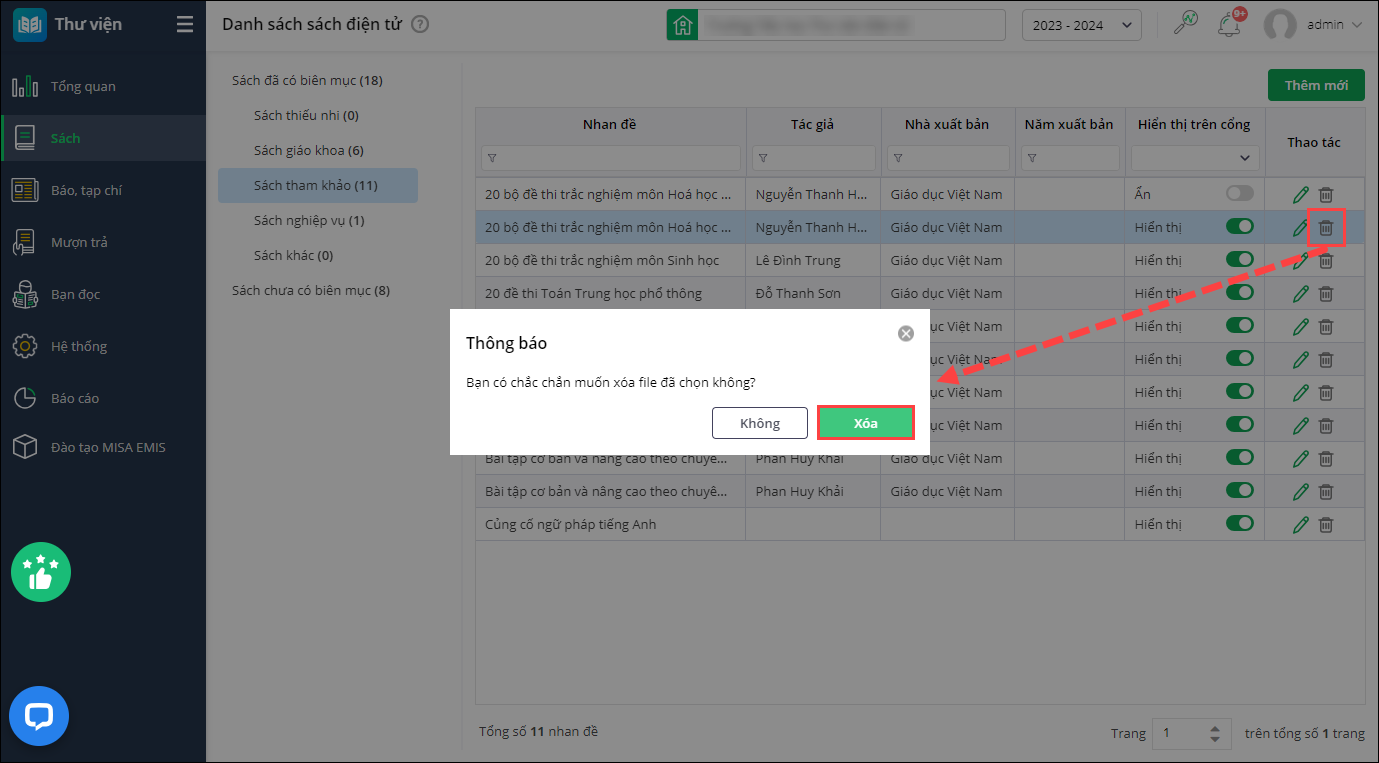 - Trường hợp muốn xóa sách điện tử khỏi hệ thống và cổng thư viện điện tử, nhấn vào biểu tượng thùng rác để xóa.