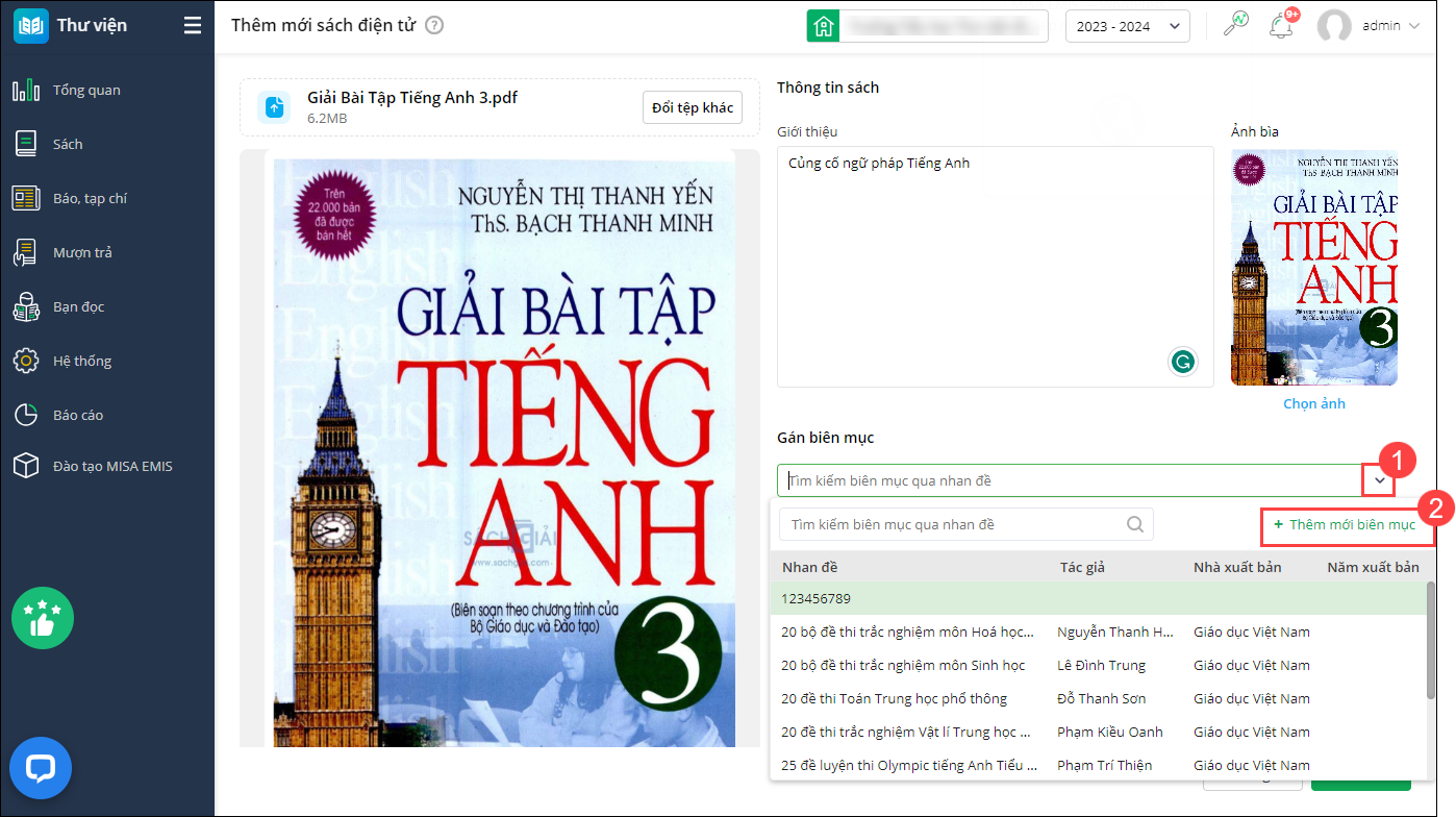 - Nhấn Lưu để cập nhật thông tin sách điện tử trê EMIS Thư viện và Cổng thư viện điện tử.