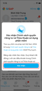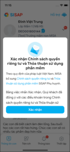 - Người dùng sau khi đăng nhập ứng dụng SISAP, sẽ nhận được thông báo yêu cầu xác nhận thỏa thuận sử dụng và chính sách quyền riêng tư.