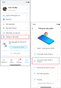 - Anh/chị có thể xem lại lịch sử xác nhận thỏa thuận bằng cách vào Thiết lập\Thông tin sản phẩm. Chọn Lịch sử xác nhận CSQRT & TTSDDV.