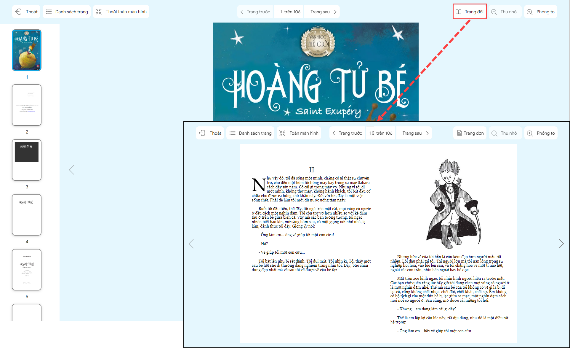 8. Trường hợp muốn đọc sách theo giang diện trang đôi như sách giấy, chọn Trang đôi.