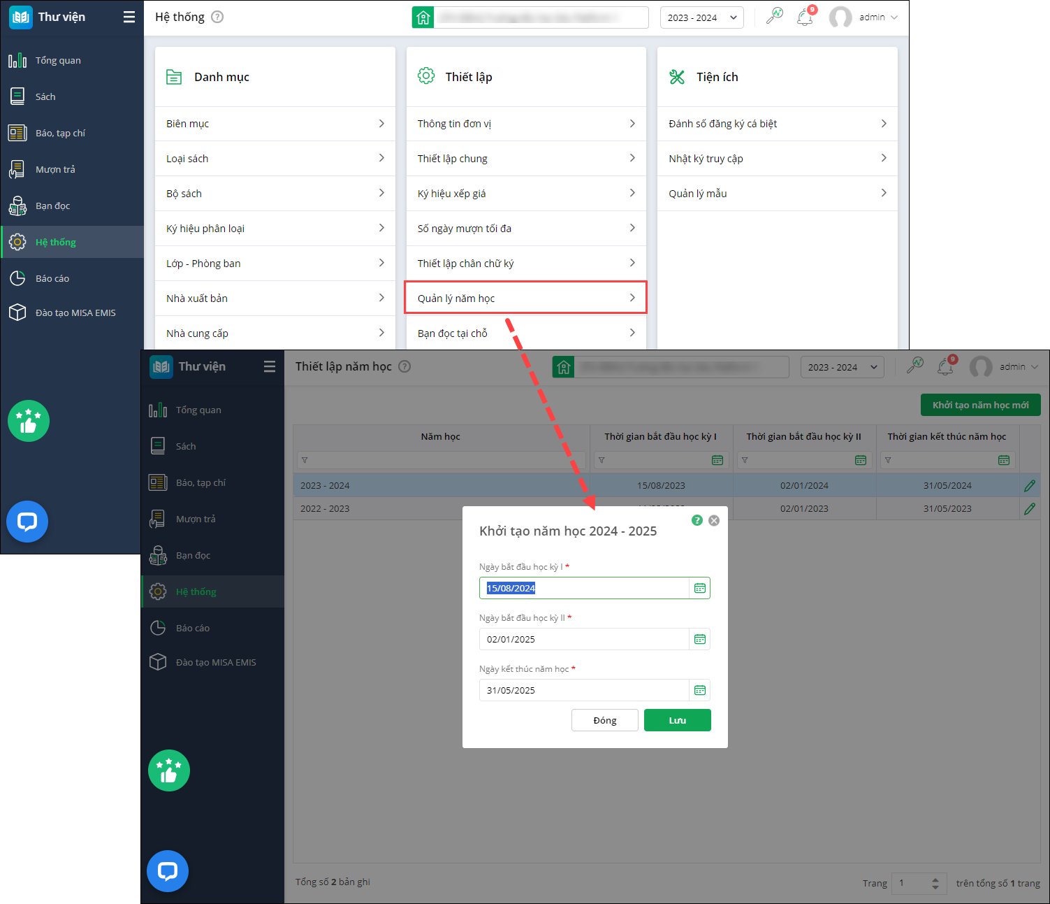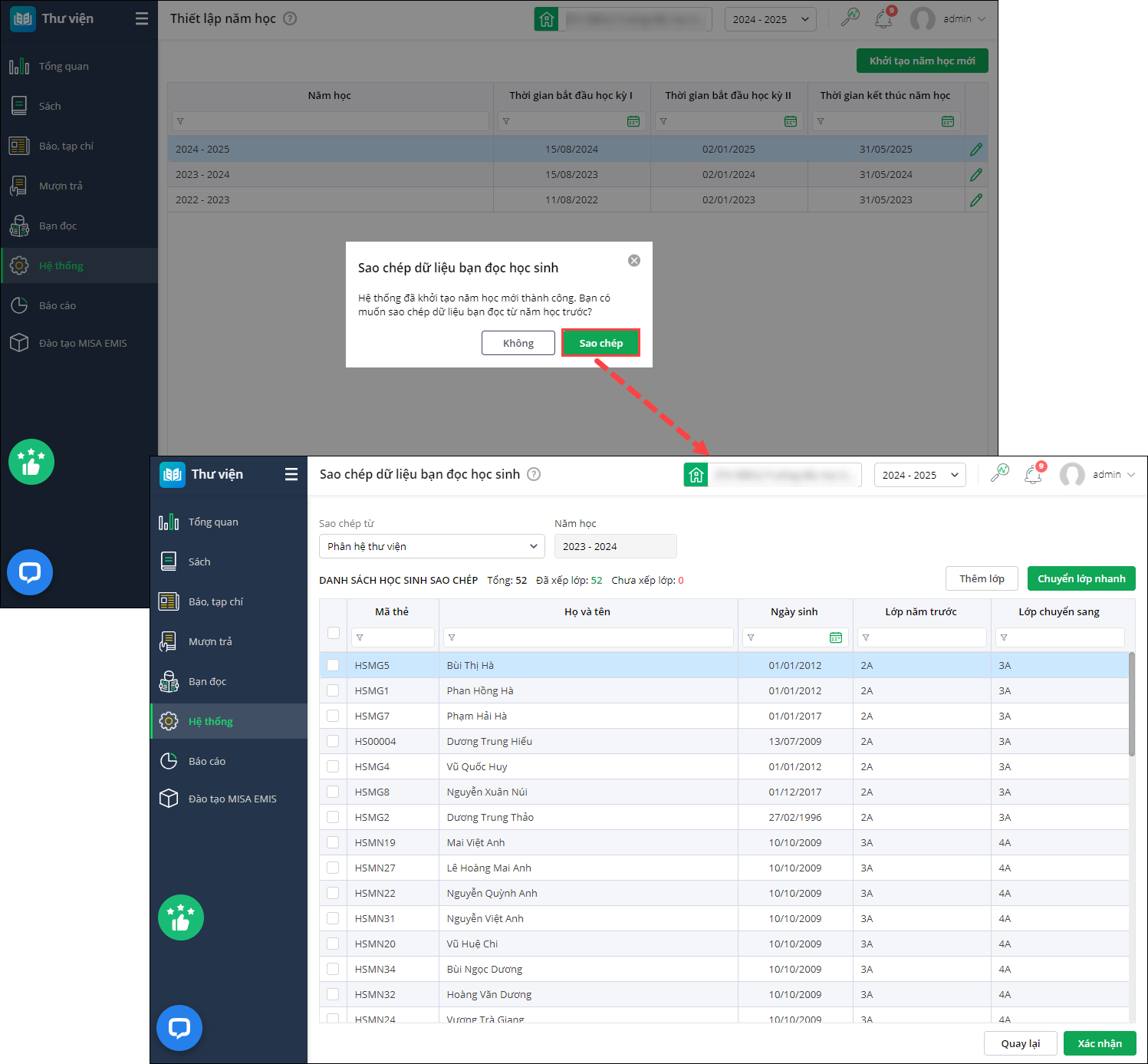 • Sau khi khởi tạo năm học thành công, EMIS Thư viện hỗ trợ sao chép dữ liệu bạn đọc mà không cần khai báo lại theo hướng dẫn tại đây.