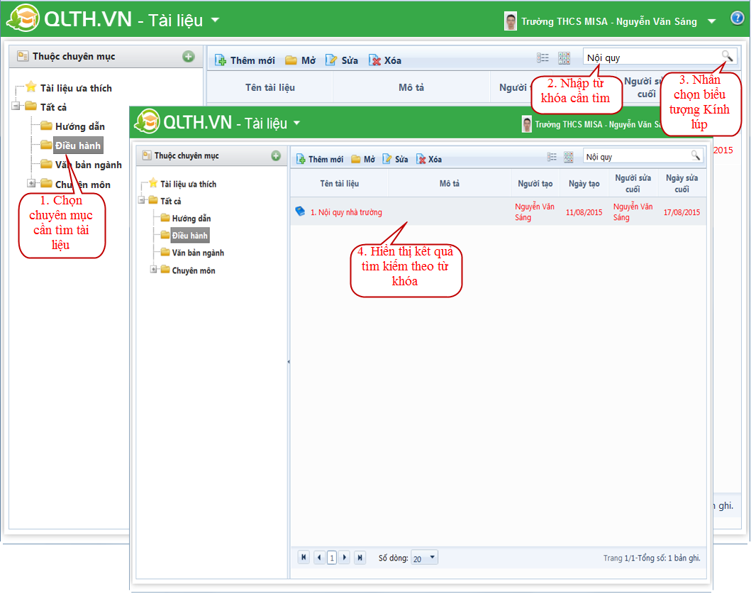 Khi có nhu cầu xem một tài liệu nào đó, có thể tìm nhanh được tài liệu đó bằng cách sử dụng chức năng tìm kiếm theo từ khóa bất kỳ: