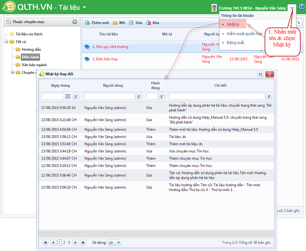 Trên ứng dụng Tài liệu, cùng một lúc cho phép nhiều người dùng cùng truy cập vào để tạo mới, bổ sung, cập nhật các tài liệu. Vì thế hệ thống cung cấp chức năng cho phép người dùng có vai Quản trị ứng dụng Tài liệu có thể kiểm tra lại các thao tác đã từng được thực hiện trên ứng dụng như: Ai, làm gì, vào ngày nào, giờ nào tại cây tài liệu nào…