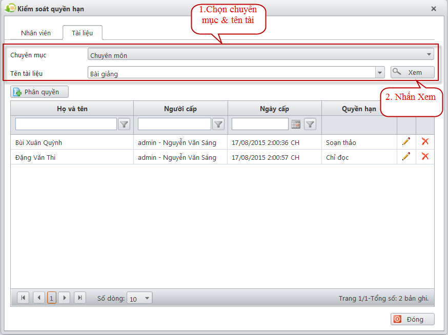 - Quản lý một tài liệu xem có những cán bộ giáo viên nào được phân quyền đọc hoặc chỉnh sửa: