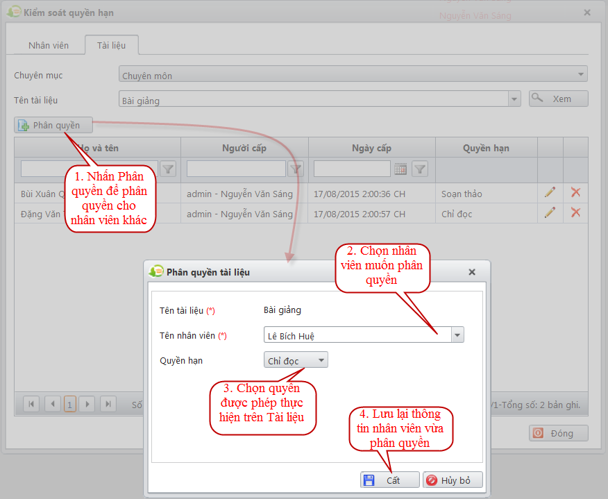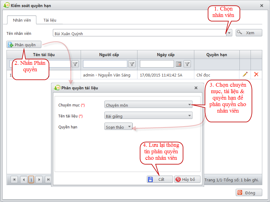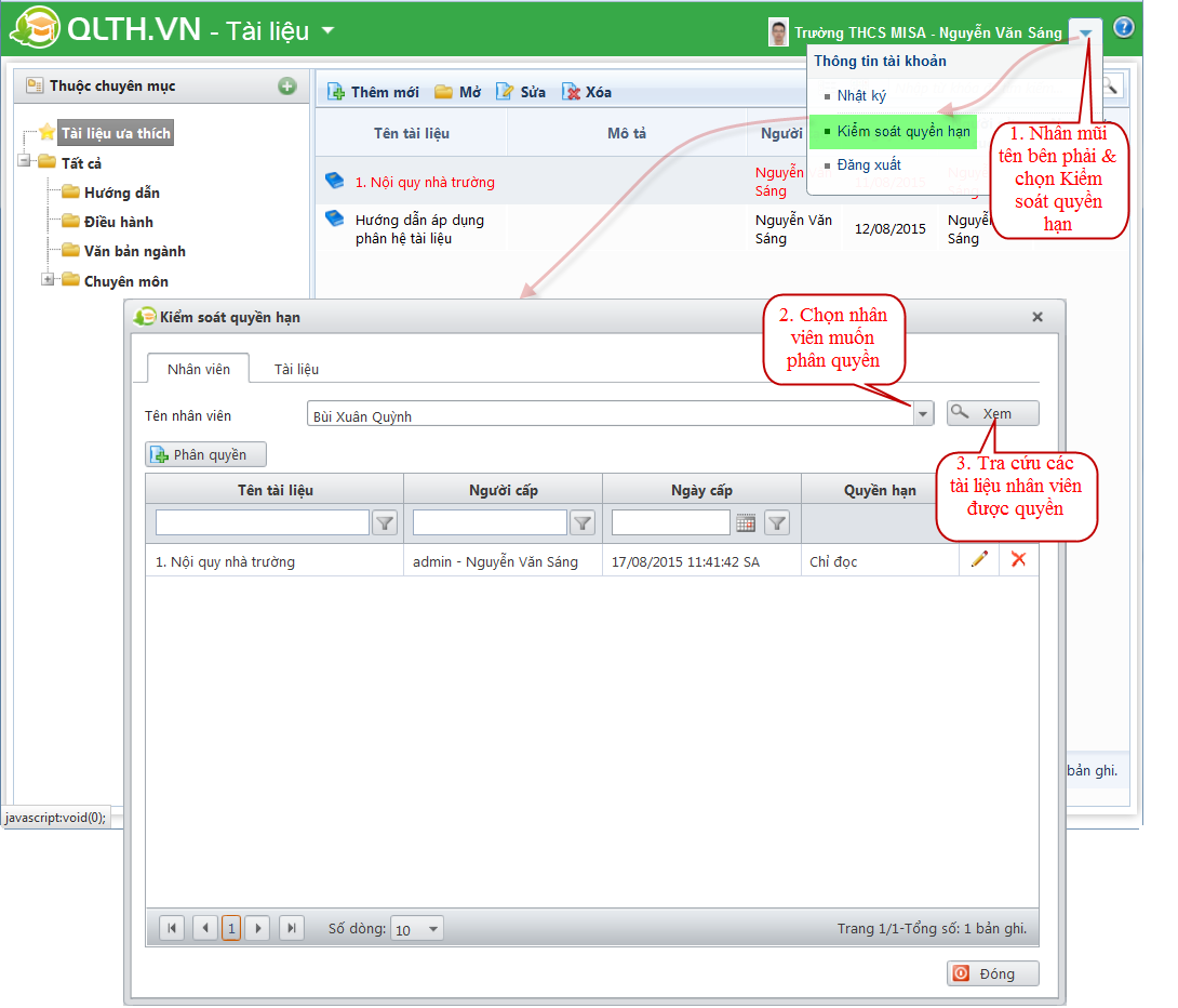 Để phân quyền thao tác tài liệu cho cán bộ giáo viên thực hiện như sau: