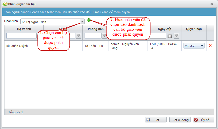- Sau đó phân quyền Soạn thảo tài liệu cho các cán bộ, giáo viên được chọn: