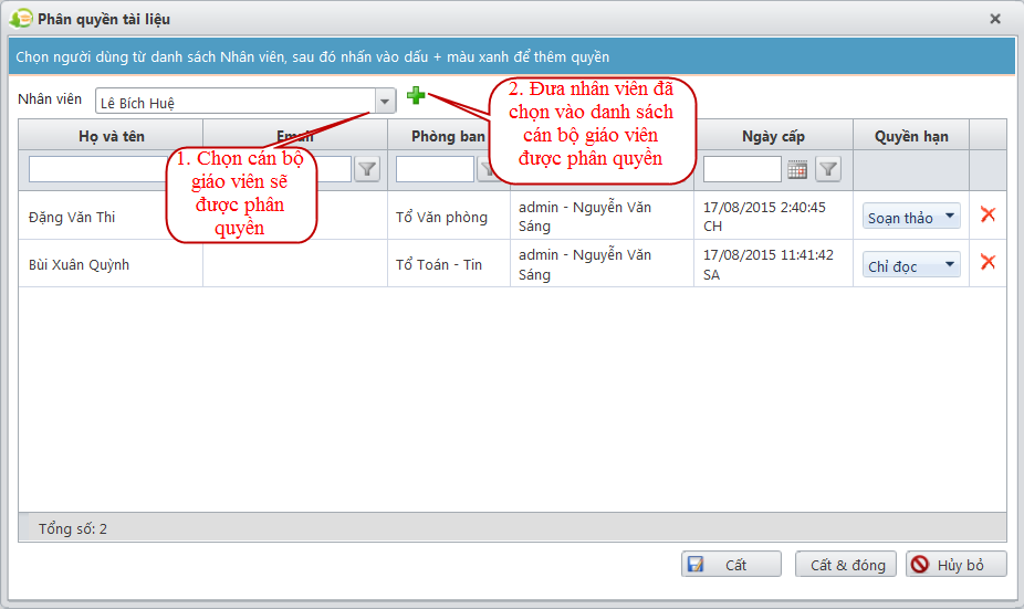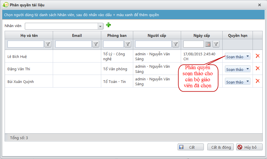 - Sau đó phân quyền Soạn thảo tài liệu cho các cán bộ, giáo viên được chọn: