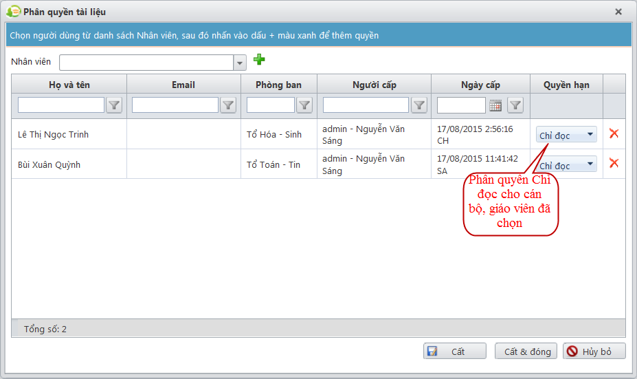 - Sau đó phân quyền Chỉ đọc tài liệu cho các nhân viên được chọn:
