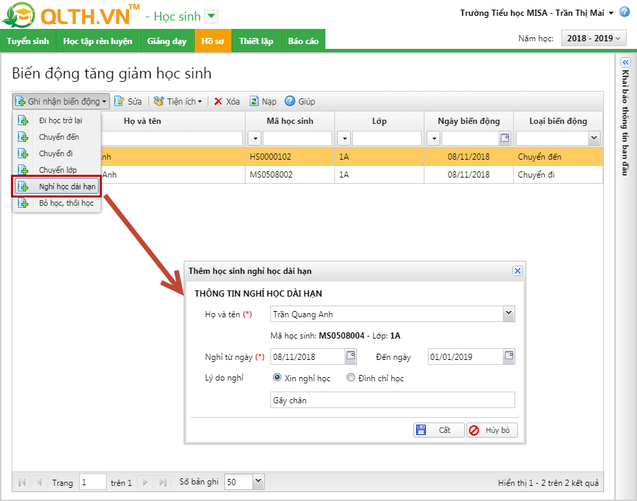 Giúp văn thư ghi nhận học sinh nghỉ học dài hạn trong trường hợp trường có sử dụng phân hệ Học sinh.