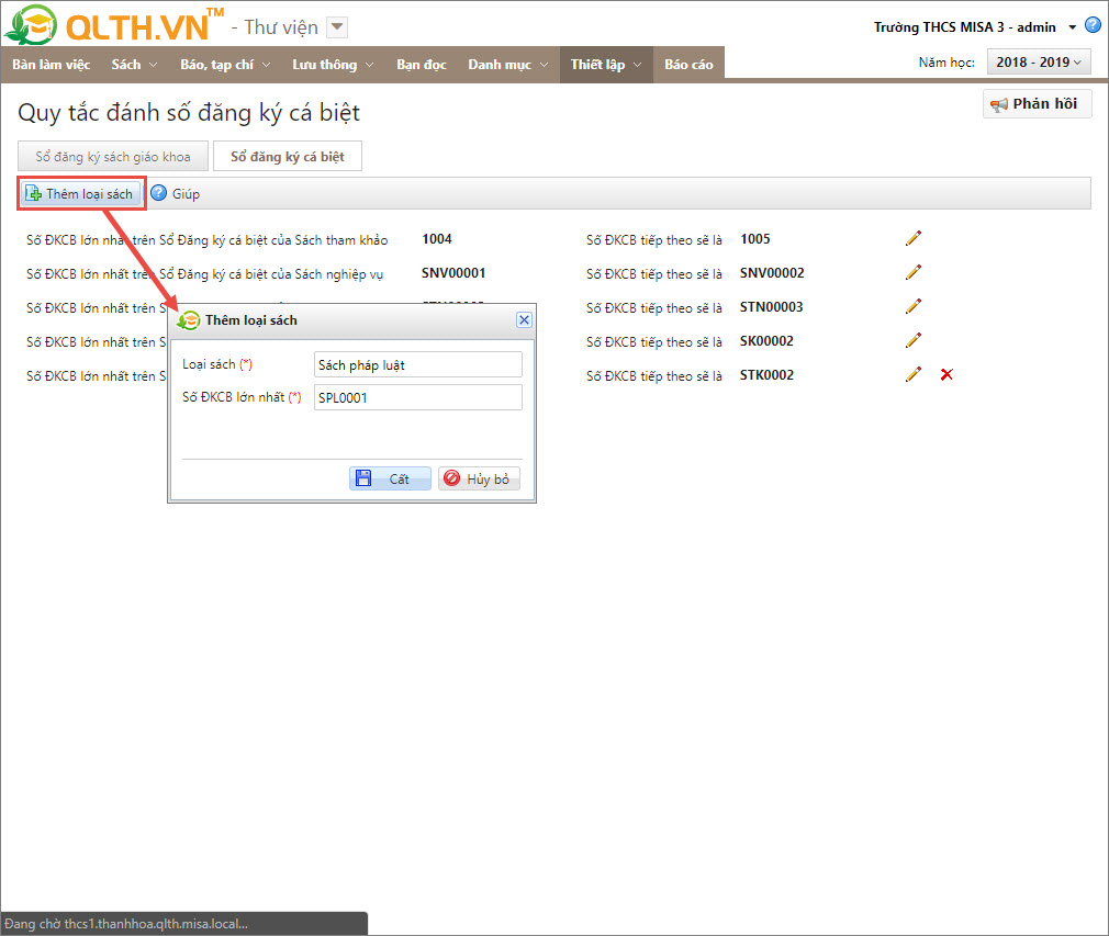- Tại tab Sổ đăng ký cá biệt, nhấn Thêm loại sách