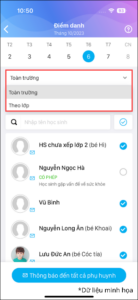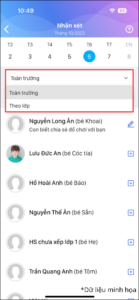 • Hiệu trưởng có thể lọc xem theo Toàn trường; Nhóm độ tuổi; Theo lớp.