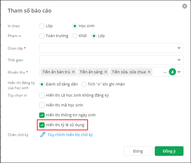 - Tùy chọn in: Hiển thị tỷ lệ sử dụng.