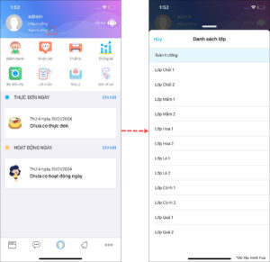 - Khi theo dõi một lớp, Hiệu trưởng xem tất cả các mục theo từng lớp để nắm bắt tình hình về điểm danh, lời nhắn, hoạt động và thực đơn.