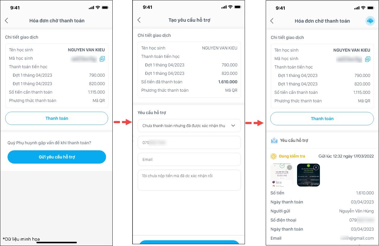 - Phụ huynh có thể gửi yêu cầu hỗ trợ khi giao dịch ở trạng thái Chờ thanh toán.