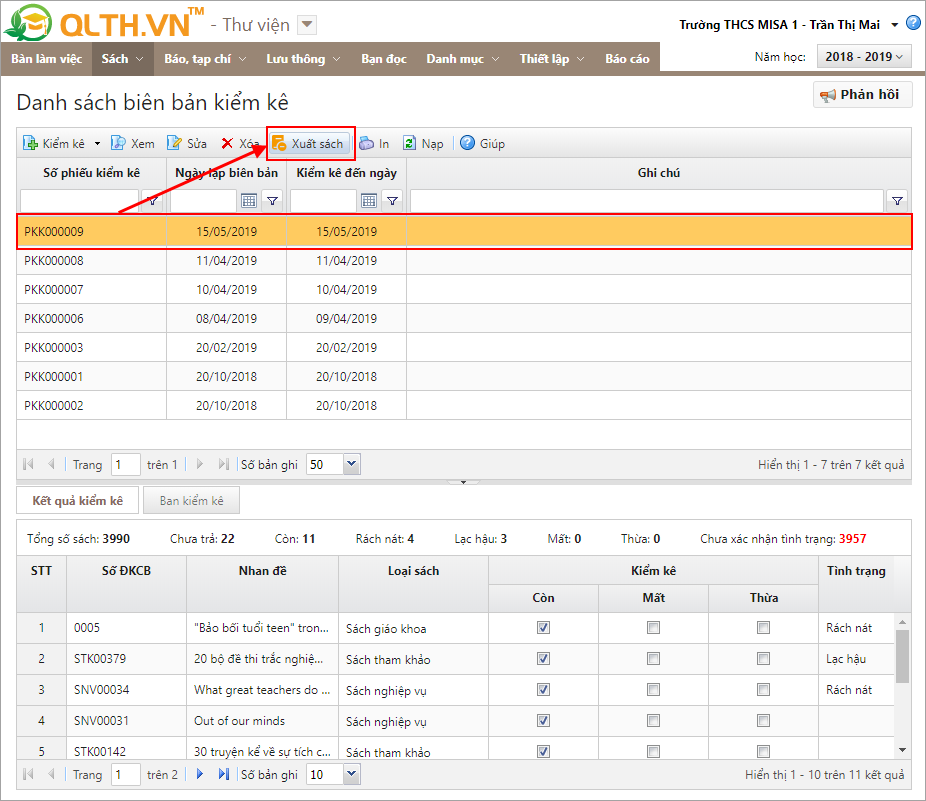 - Trên Danh sách biên bản kiểm kê, CBTV chọn phiếu kiểm kê có sách cần xuất, nhấn Xuất sách