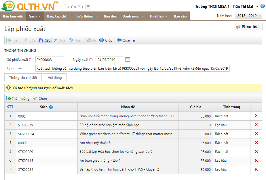 Giúp cán bộ thư viện sau khi thực hiện kiểm kê sách có thể xuất luôn những sách không còn sử dụng được.