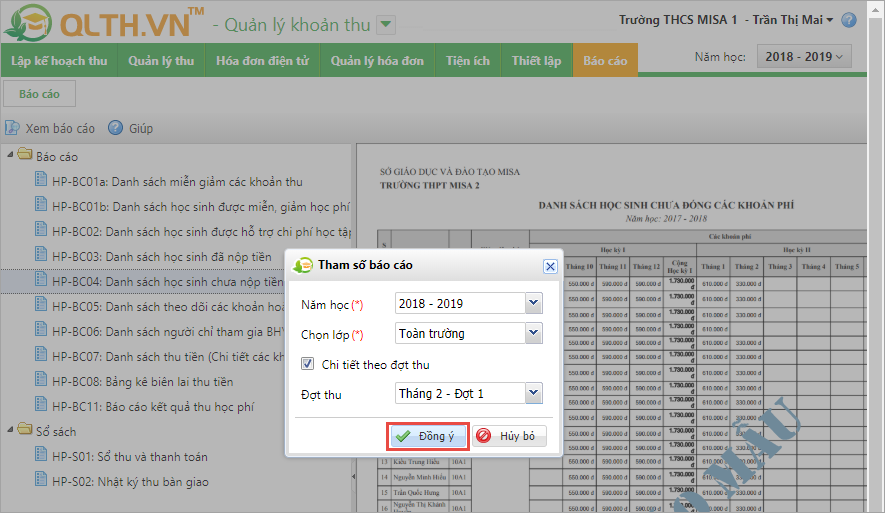 • Trên tham số báo cáo, chọn lớp cần in báo cáo. Tích chọn tại phần Chi tiết theo đợt thu.