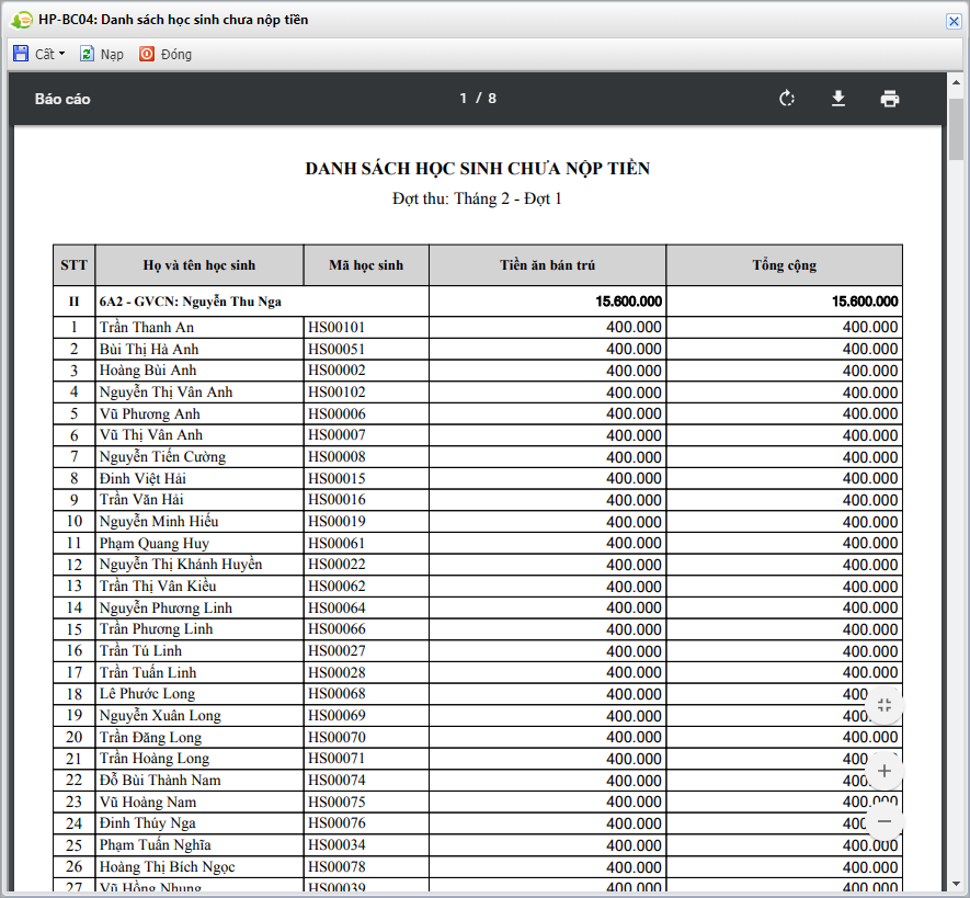 • Vào menu Báo cáo\HP-BC04: Danh sách học sinh chưa nộp tiền