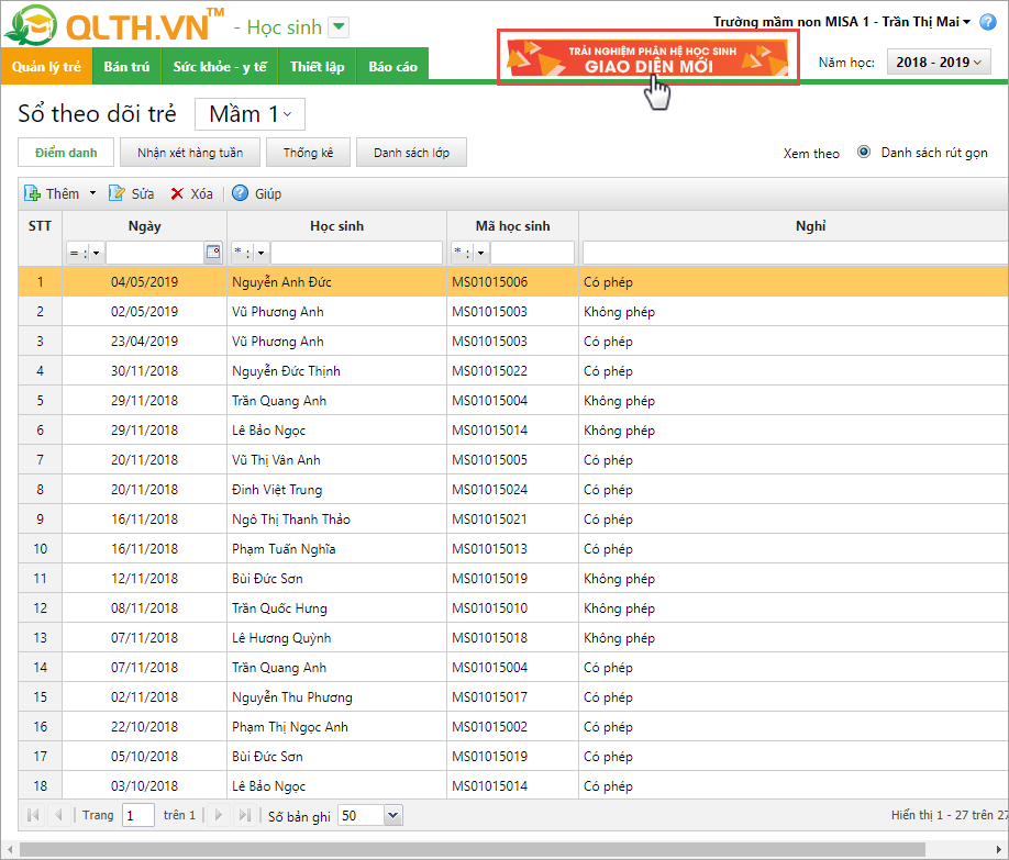 Giúp các đơn vị là trường mầm non có thể dễ dàng thực hiện quản lý thông tin của học sinh, lên kế hoạch hoạt động trong tuần hay thực hiện xét tốt nghiệp chương trình giáo dục mầm non cho các học sinh. Anh/chị có thể nhanh chóng trải nghiệm nghiệp vụ quản lý trẻ mới bằng cách nhấn vào màn hình thông báo Trải nghiệm phân hệ học sinh giao diện mới.