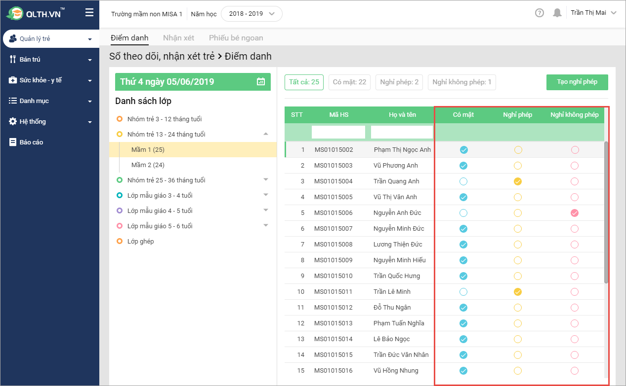 Giúp giáo viên phụ trách lớp ghi nhận thông tin điểm danh của từng học sinh hay nhiều học sinh cùng lúc trong ngày.