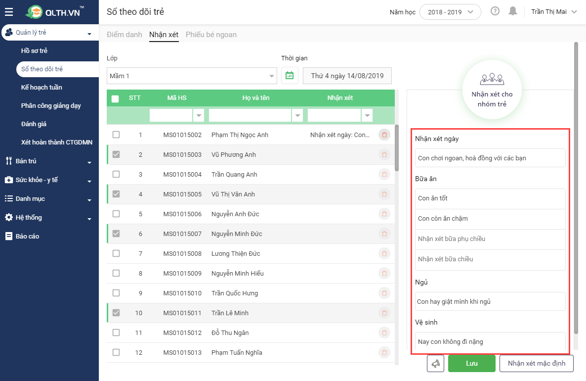 Giúp giáo viên phụ trách lớp ghi nhận được các nhận xét cho từng trẻ hoặc nhập nhanh nhận xét cho nhiều trẻ cùng 1 lúc.