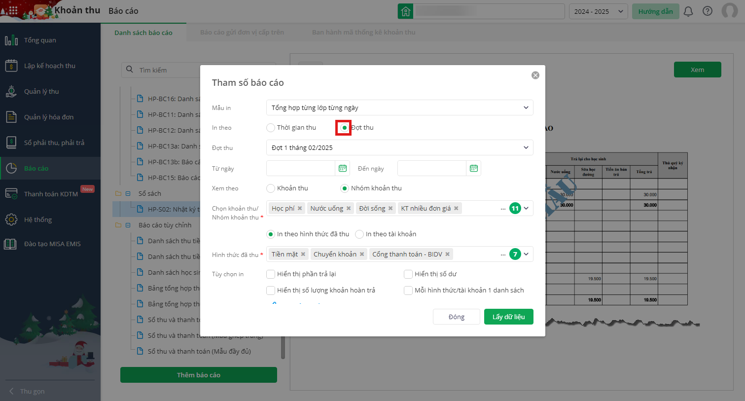 - Để in được Nhật ký thu bàn giao tổng hợp thông tin theo đợt thu để đối soát số tiền thu được trên Danh sách thu tiền, anh/chị tích chọn Đợt thu, chọn đợt thu cần tổng hợp thông tin
