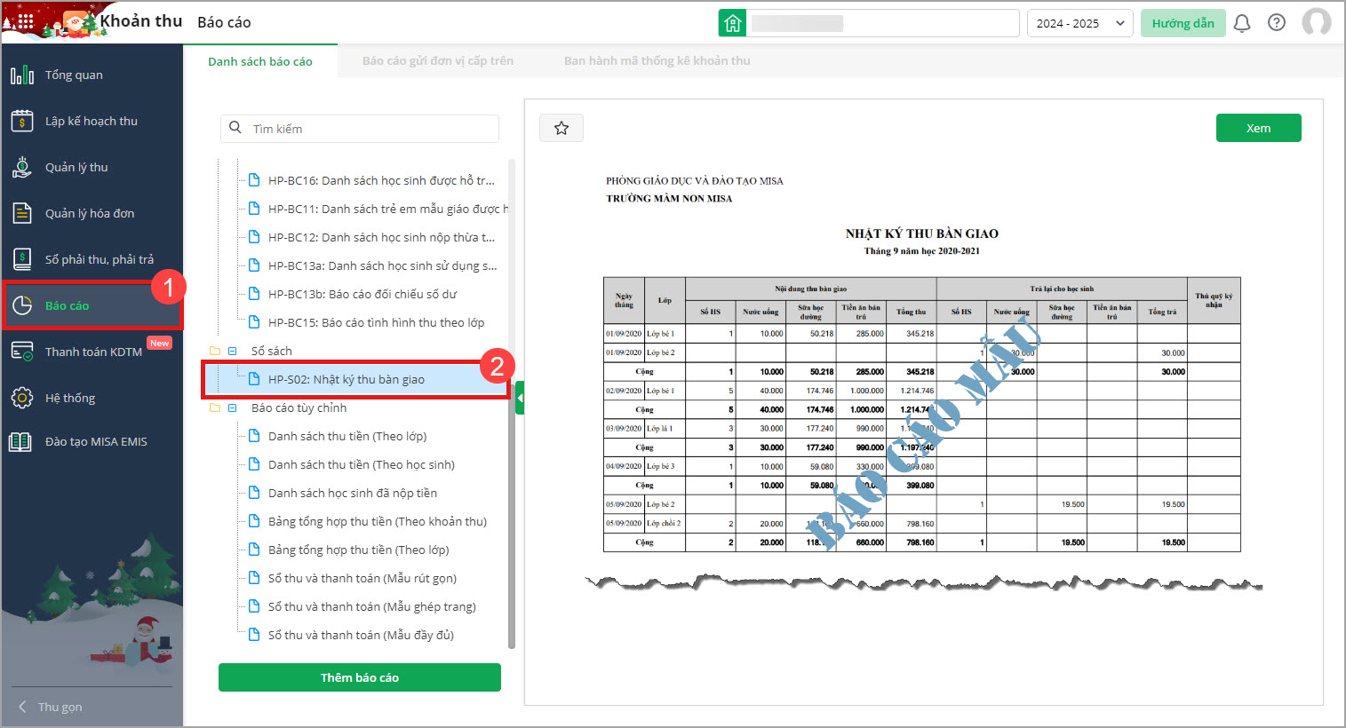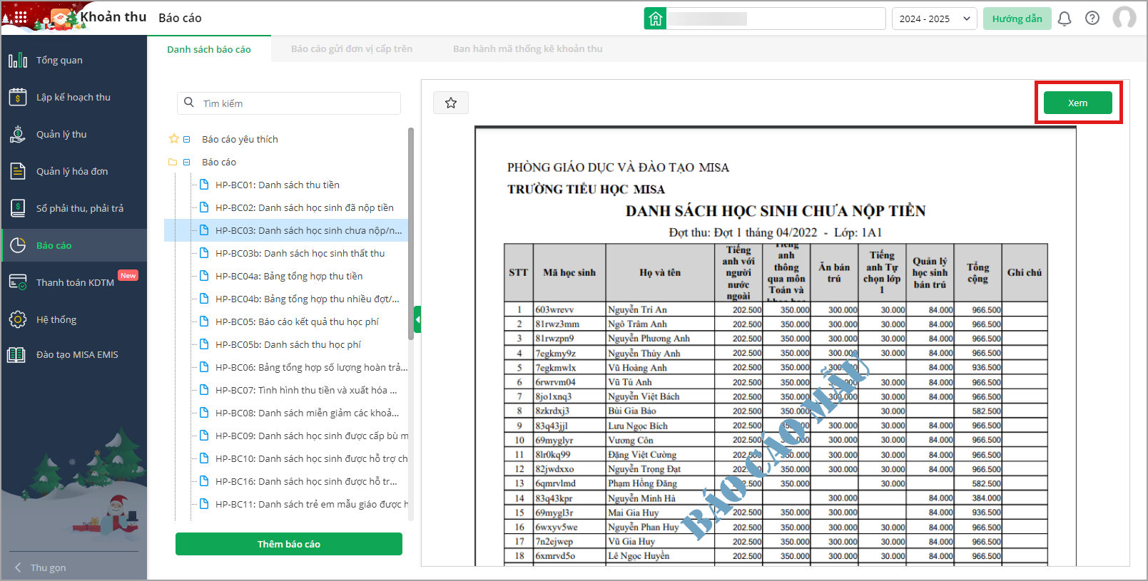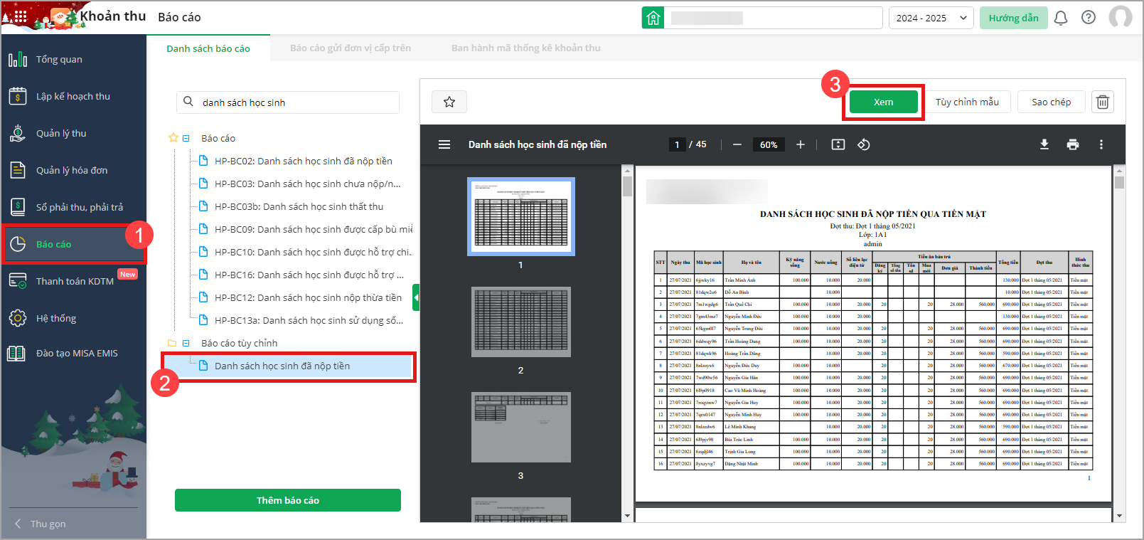 Tại menu Báo cáo\Danh sách học sinh đã nộp tiền (tùy chỉnh)