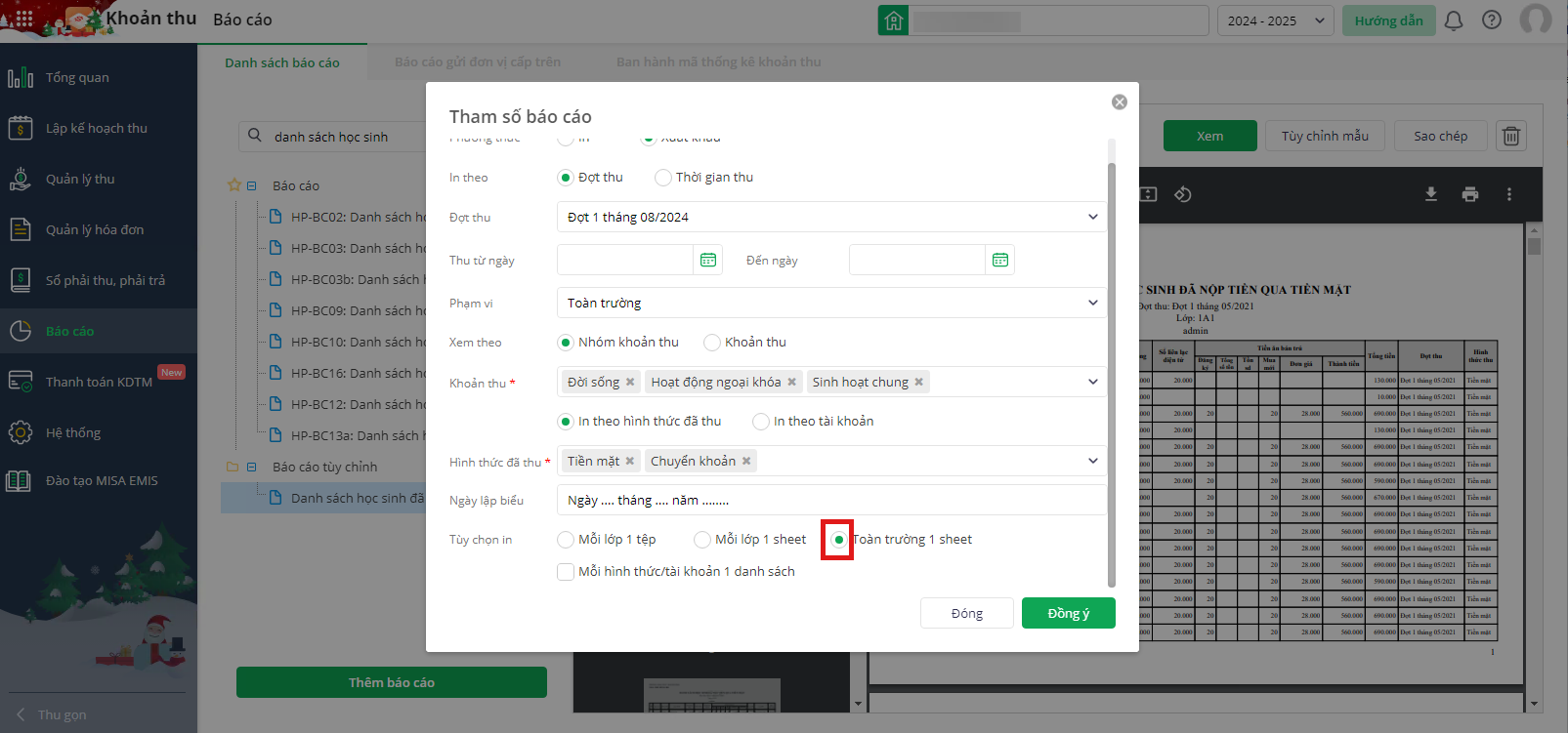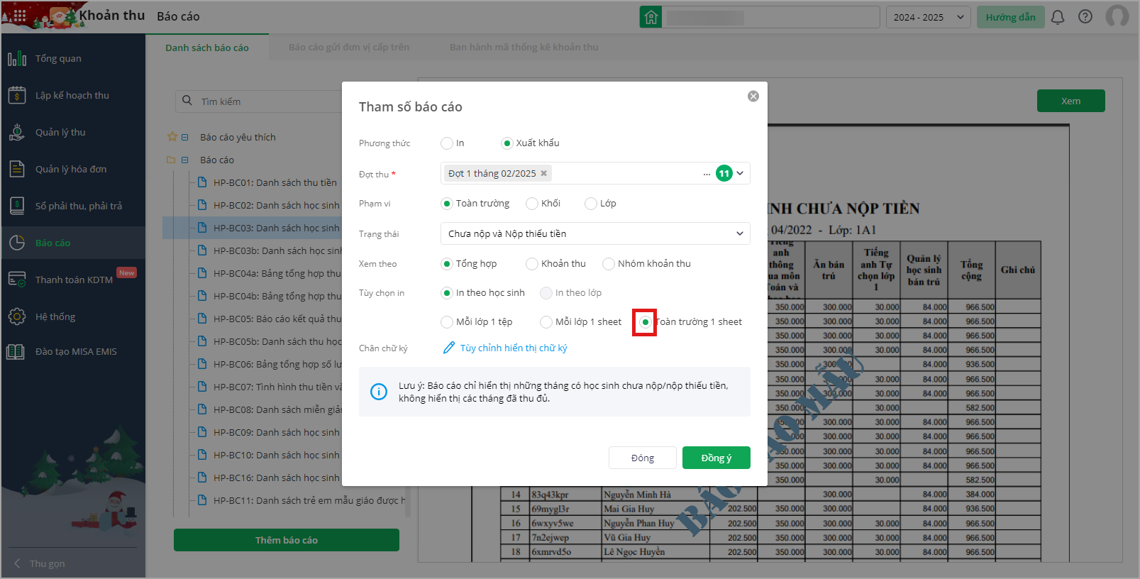 - Nếu muốn xuất khẩu Danh sách học sinh đã nộp tiền không bị lặp tiêu đề, trên form tham số báo cáo anh/chị chọn Toàn trường 1 sheet
