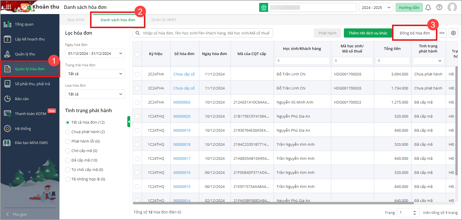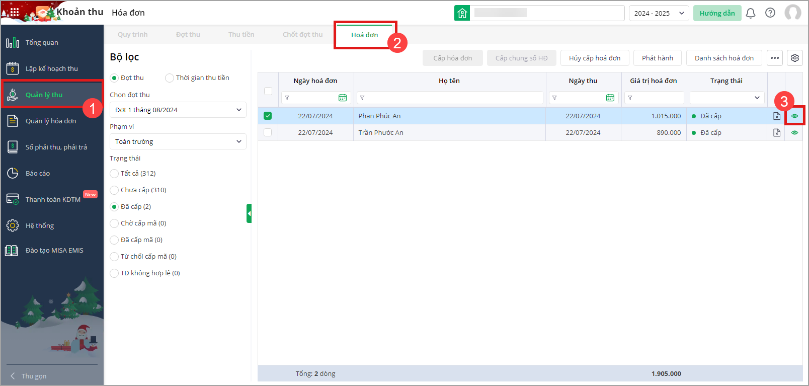 Tại menu Quản lý thu\Hóa đơn sau khi đồng bộ lại hóa đơn sẽ được cập nhật đúng giá trị hóa đơn mới điều chỉnh