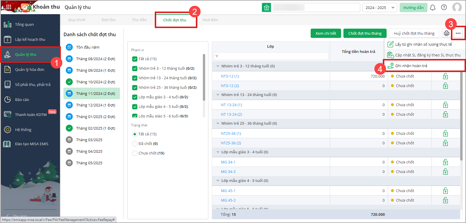 Ở tháng tiếp theo, học sinh xin nghỉ học và kế toán cần hoàn trả lại tiền cho 4 buổi ăn chưa sử dụng. Tuy nhiên, khi hoàn trả, hệ thống báo lỗi không thể hoàn vì đã xuất hóa đơn.