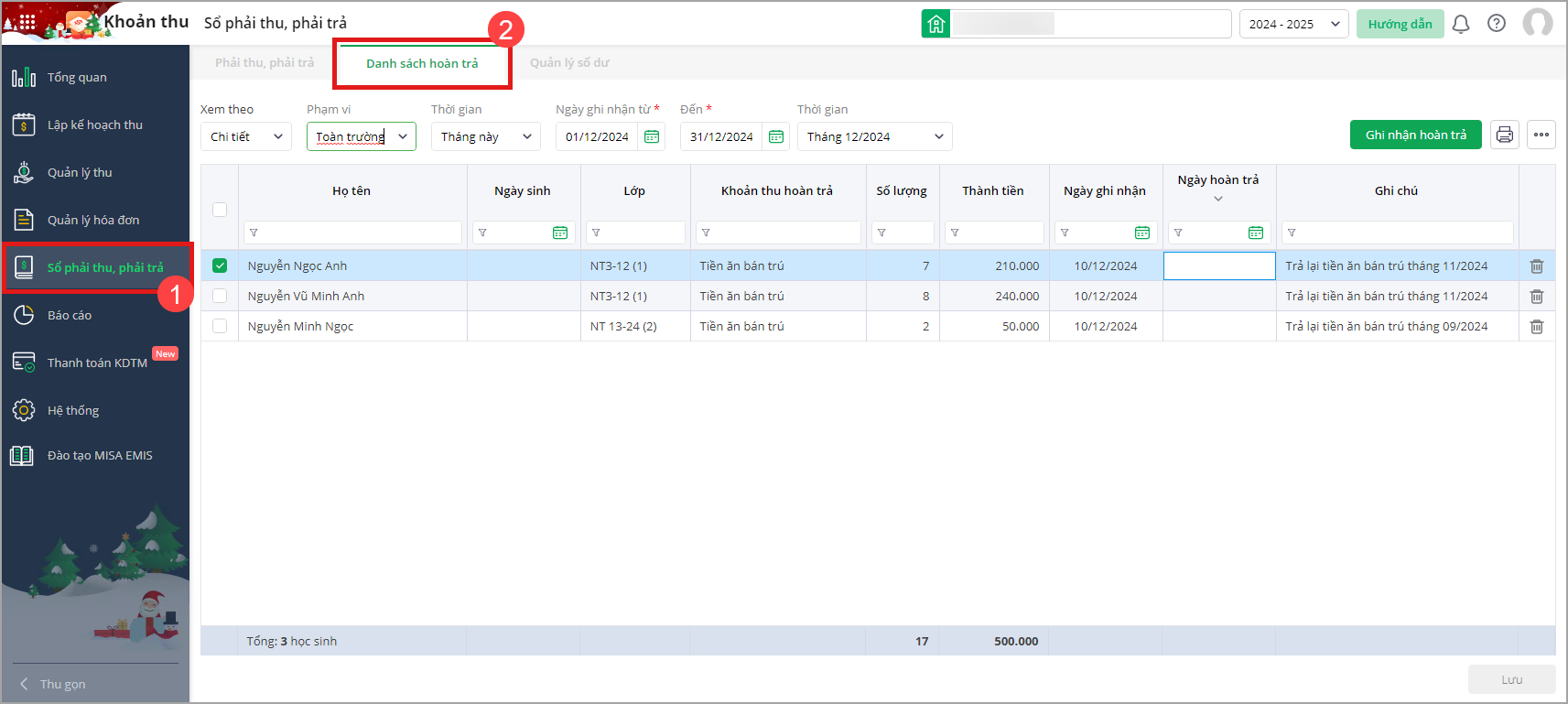 Với những khoản thu được ghi nhận hoàn trả thì sẽ ghi nhận vào Số phải thu, phải trả\Danh sách hoàn trả
