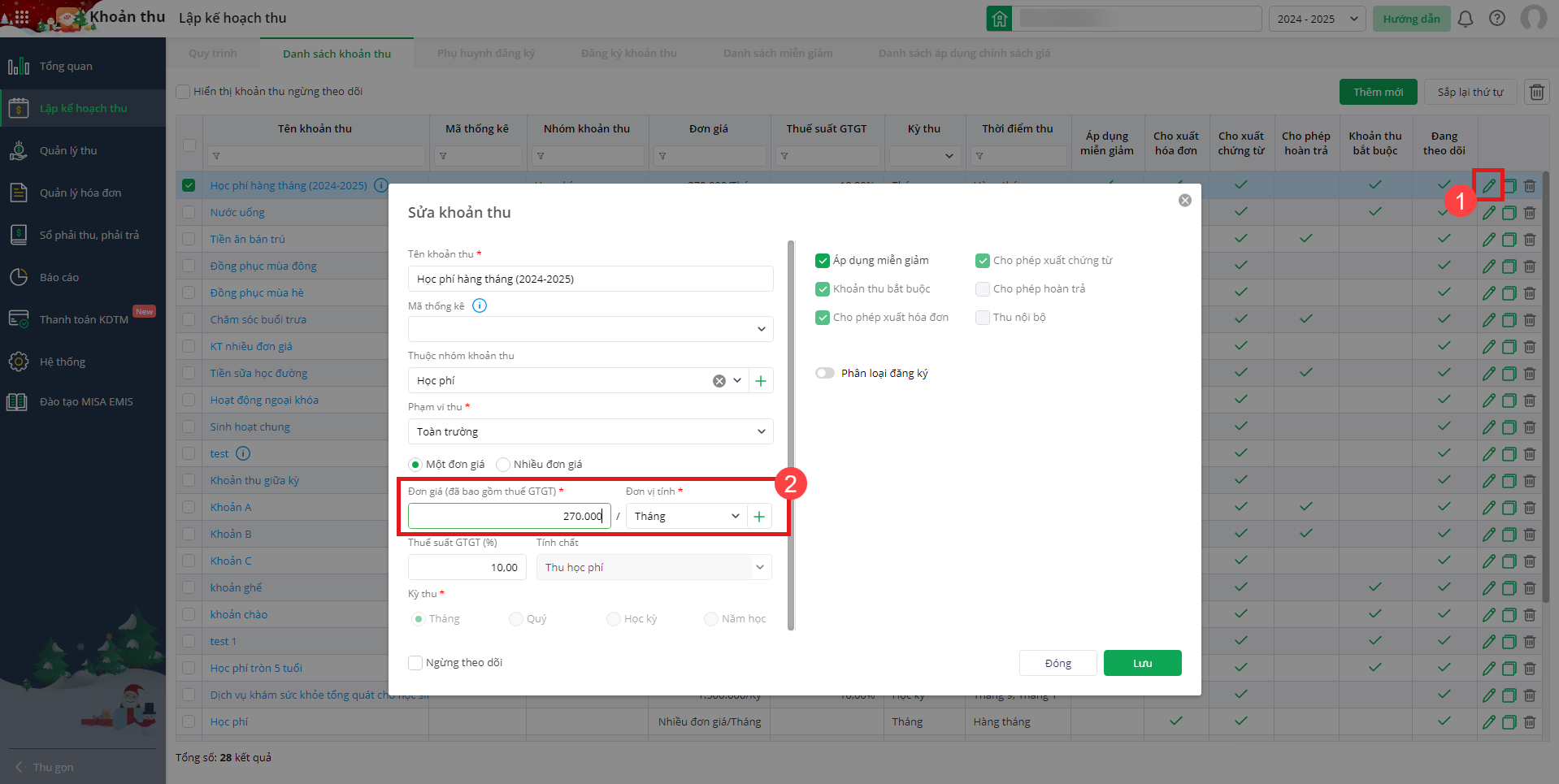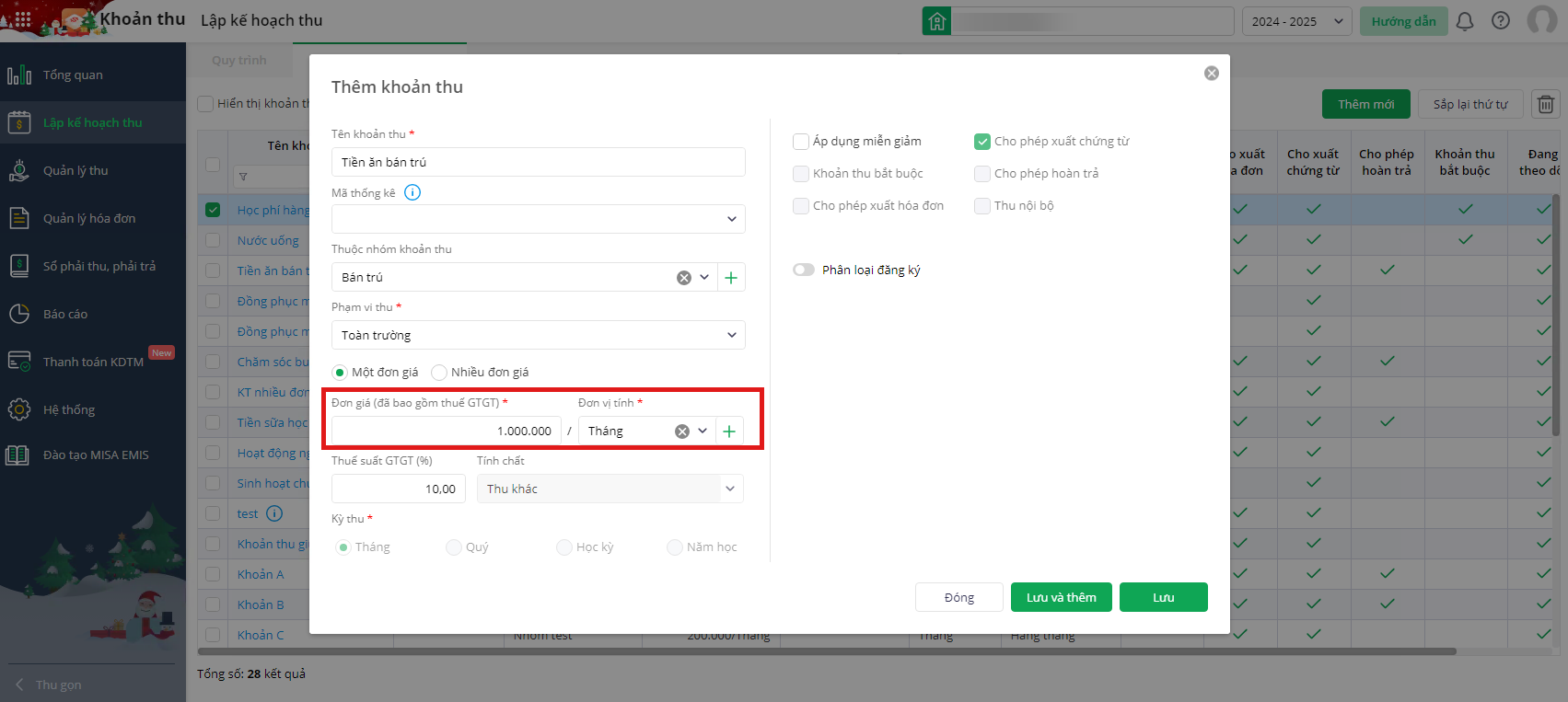 - Khi sửa khoản thu phần mềm bổ sung thông tin cho đơn giá thành Đơn giá (đã bao gồm thuế GTGT)