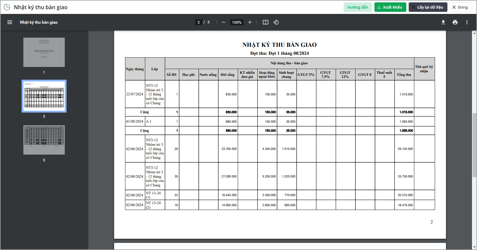 - Nhật ký thu bàn giao tổng hợp thông tin theo đợt thu để đối soát số tiền thu được trên danh sách thu tiền